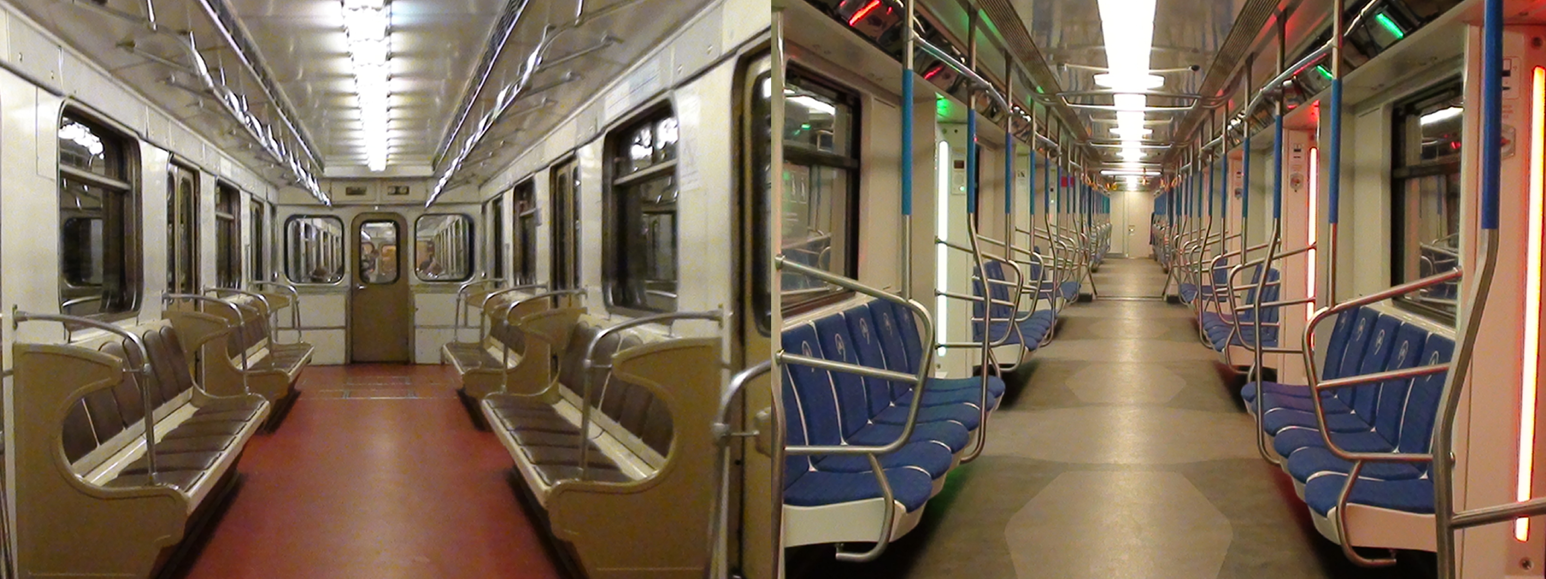 На ТКЛ уже маленький процент Е-образных. Чуть ли не по 8 составов за баранку (возможно меньше, спецаильно не считал). Если честно, ни сколько не жалко. Еж/Ем меняют на "Москов". Они ощутимо тише, лучше и комфортнее сараев в виде Еж/Ем. Т.е. вполне себе адекватная замена. Для сравнения предлагаю фотку.MetroGnom писал(а):Е-образных в июне
