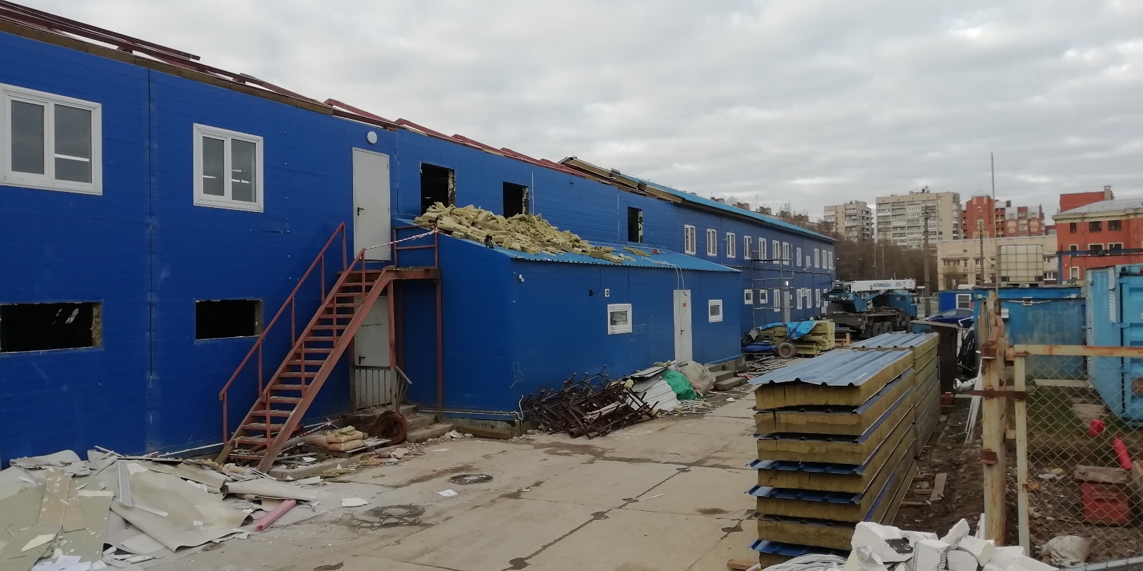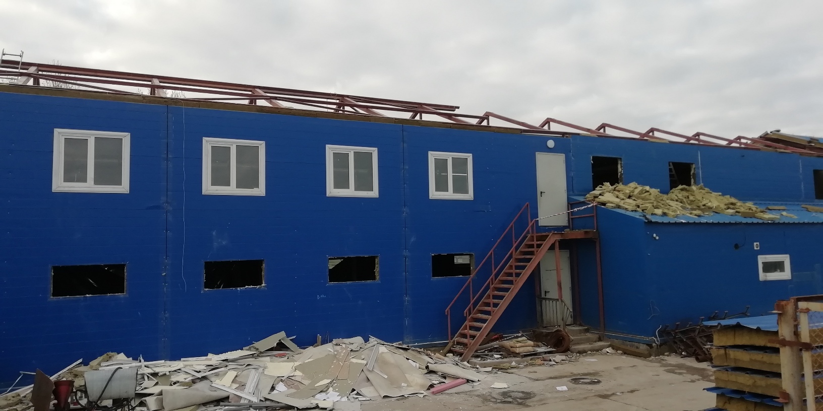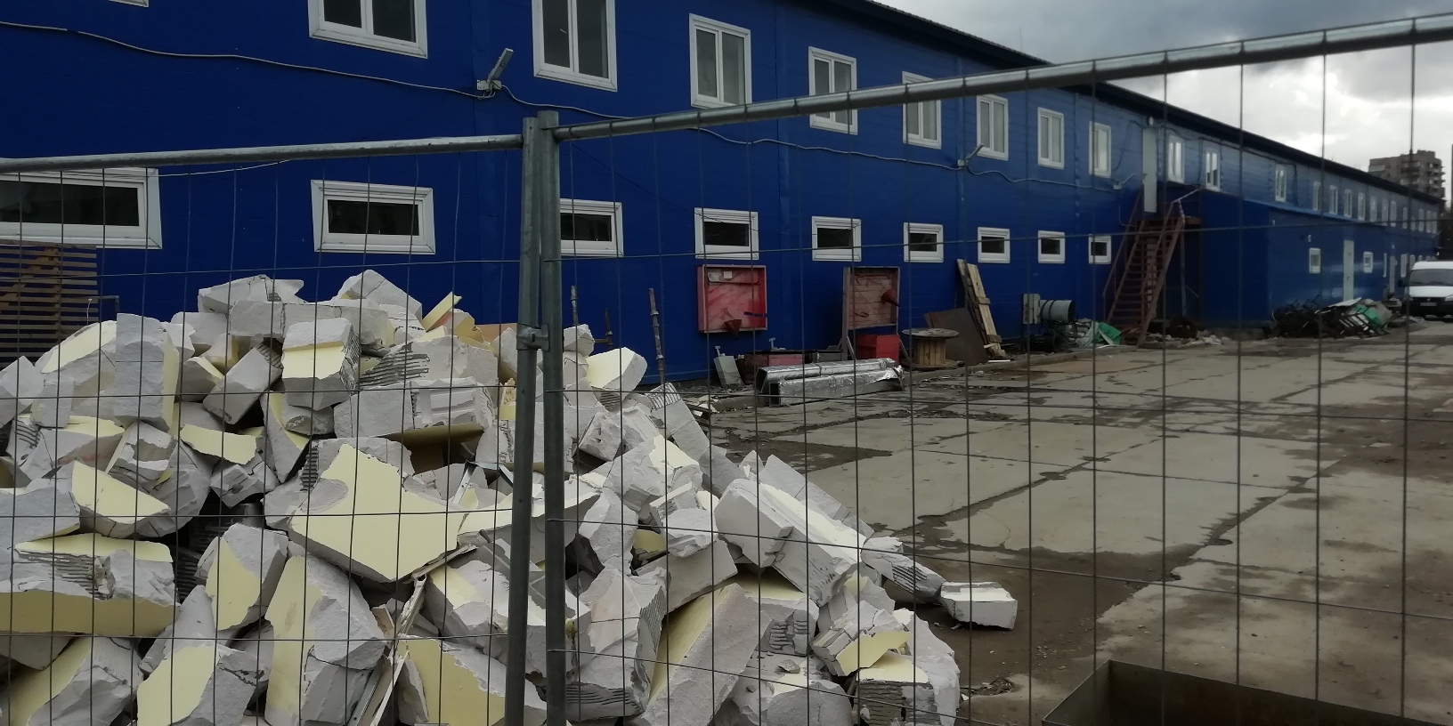 Начали разбирать АБК на части территории бывшей блощадки шахты 624, выносят строительный мусор: