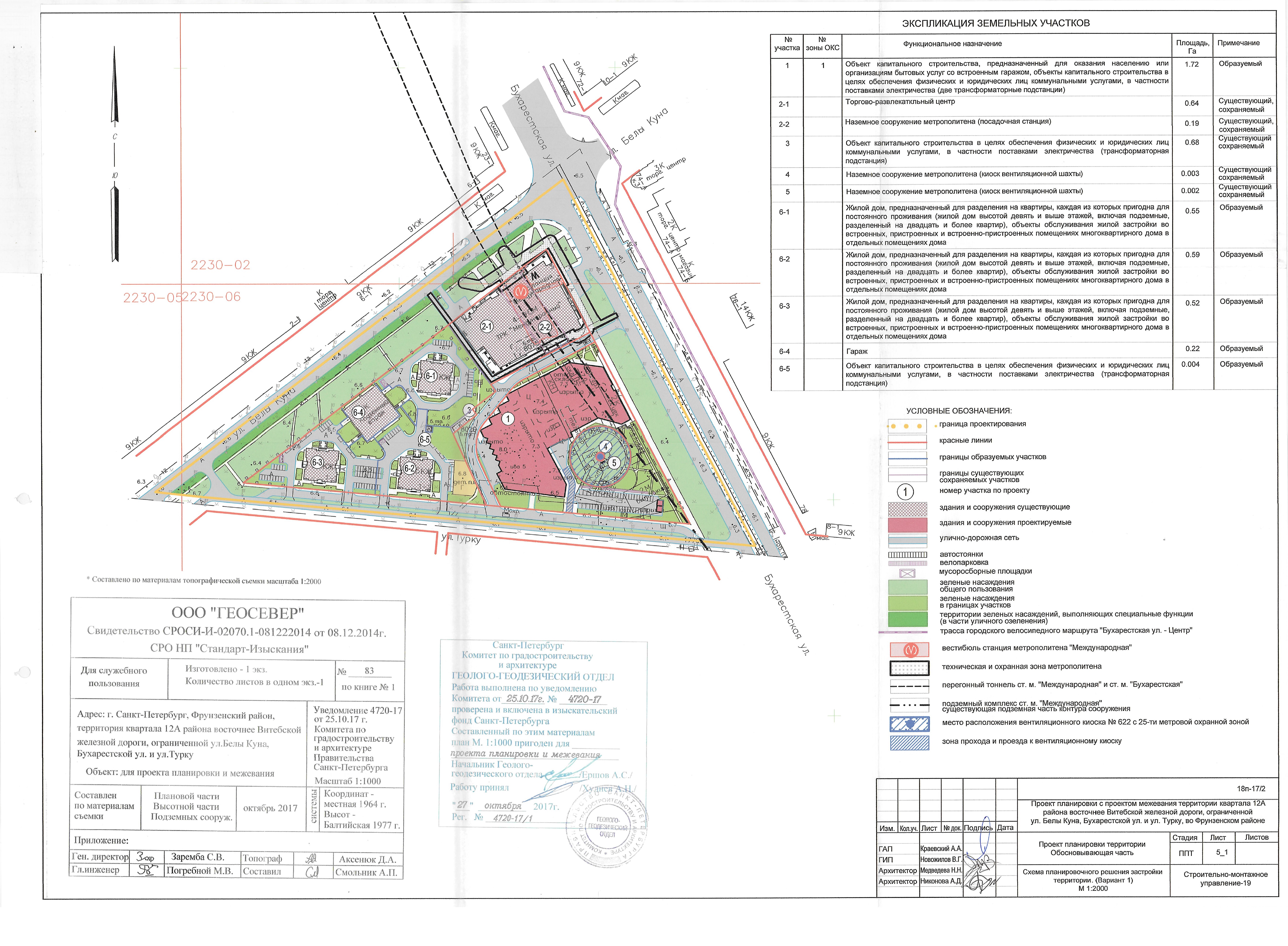 Постановлением Правительства СПб от 29.11.2019 г. № 832 "О внесении изменений в постановление Правительства СПб от 11.12.2007 г. № 1613 "Об утверждении проекта планировки с проектом межевания территории квартала 12А, района восточнее Витебской железной дороги, ограниченной ул. Белы Куна, Бухарестской ул. и ул. Турку, во Фрунзенском районе" на месте площадки появится "Объект капитального строительства, предназначенный для оказания населению или организациям бытовых услуг со встроенным гаражом, объекты капитального строительства в целях обеспечения физических или юридических лиц коммунальными услугами, в частности поставками электричества (две трансформаторные подстанции)".