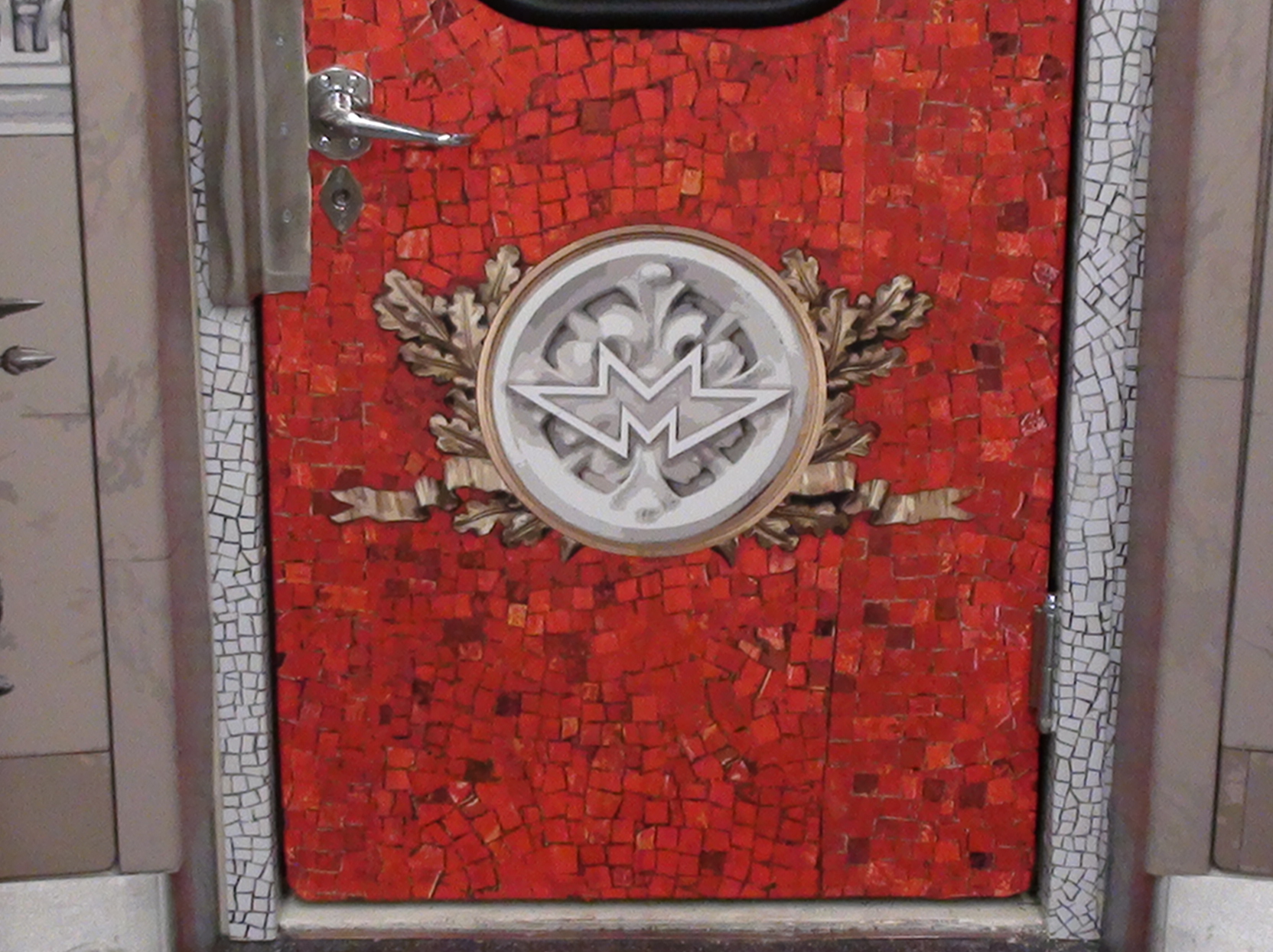 Это наклейка в поезде Охта. На дверях и потолке. Вагоны 23003 и 24004. В этом же составе аналогичные есть, только вместо буквы М там ОЭВРЗ и ТМХ.