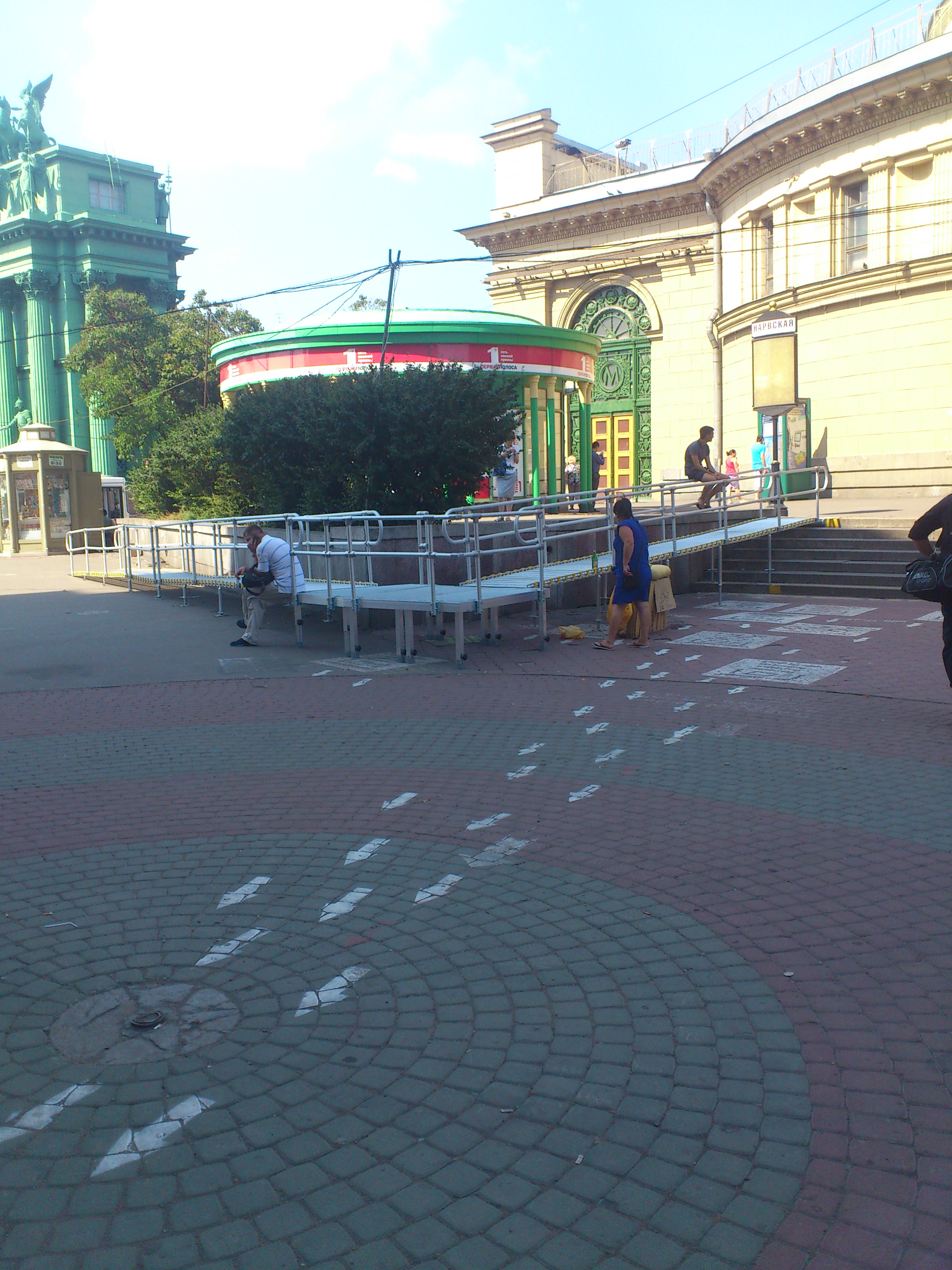 2. У вестибюлей многих станций начали активно устанавливать здоровенные пандусы. Занимают кучу места, а их эффективность в нынешней ситуации вызывает огромные вопросы, т.к. после них еще надо преодолеть целую кучу препятствий. В качестве иллюстрации привожу как раз Нарвскую (а замечено также на Кировском заводе и Автово):