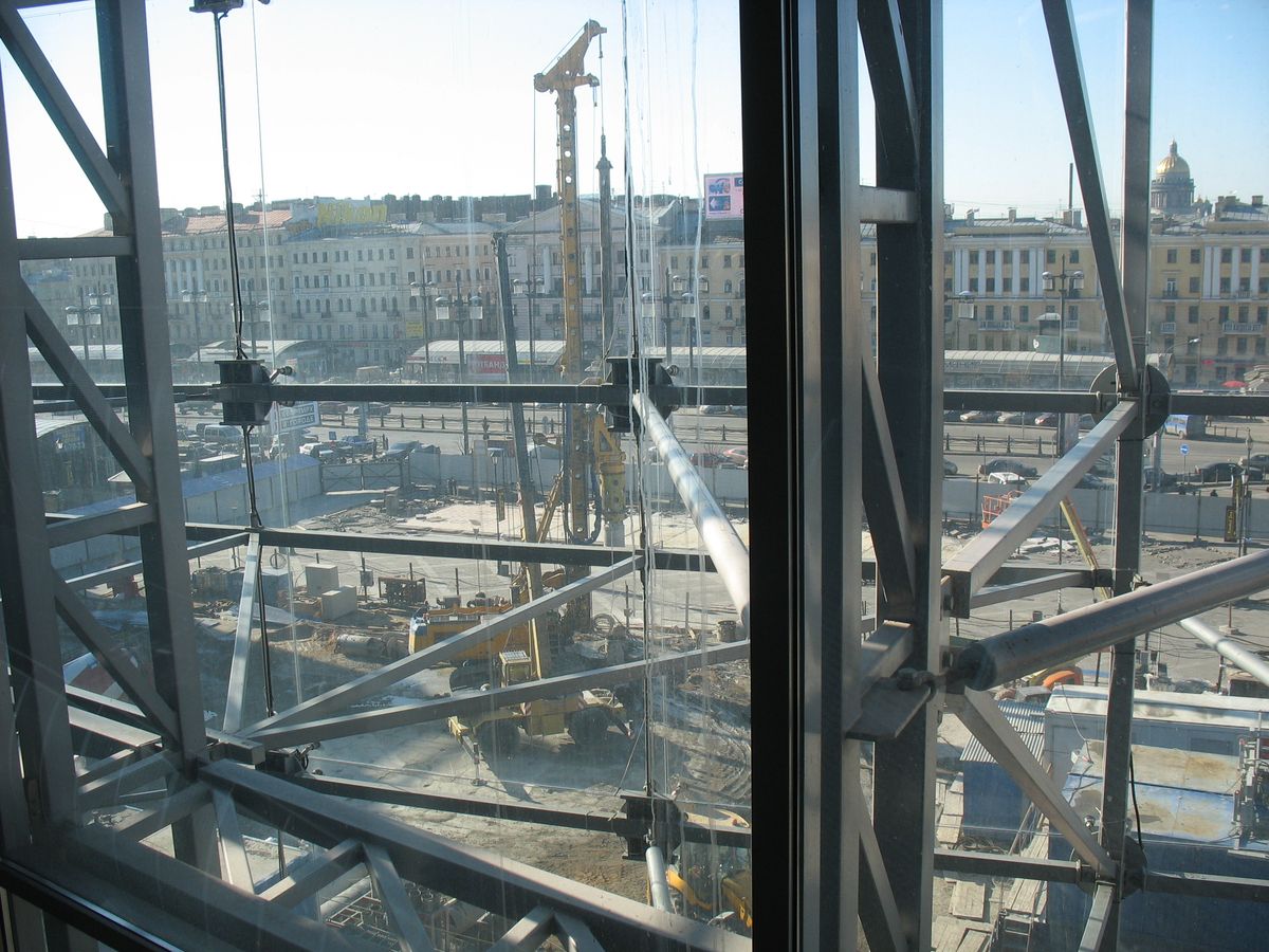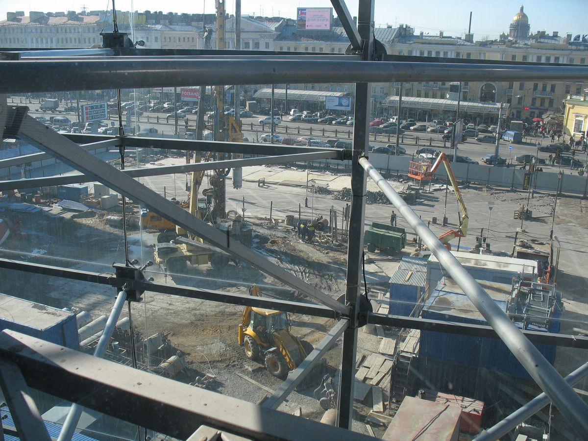 Стройплощадка расширилась за счет снесенного павильона. Видимо, готовят площадку для складирования деталей щита заранее. Кстати, остальные павильоны сносить совершенно не спешат, даже на одном сегодня новый кондиционер вешали. Журналисты с заявлениями поторопились явно. Ах да, фотки... =)