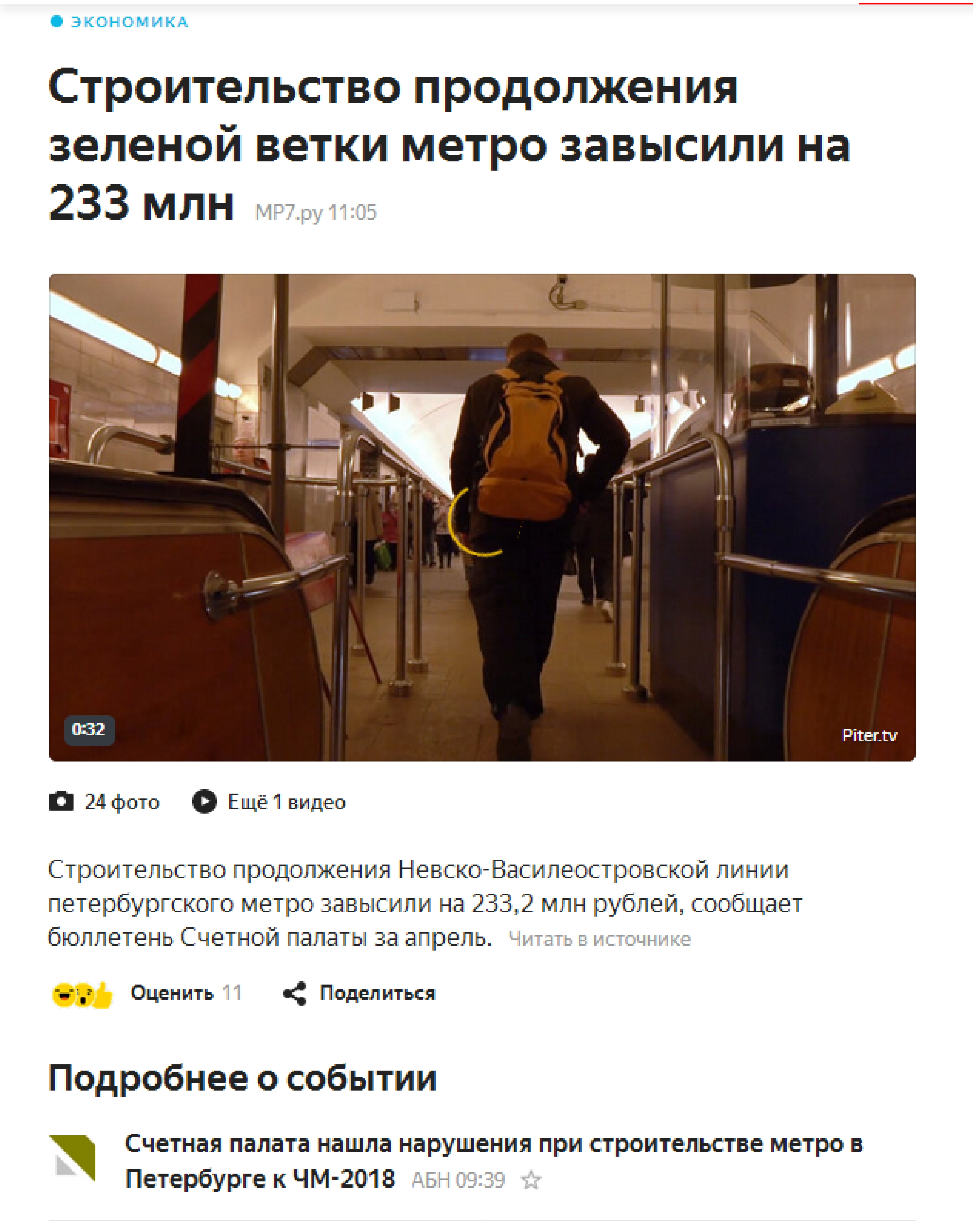 Счетная палата нашла нарушения при строительстве метро в Петербурге к ЧМ-2018