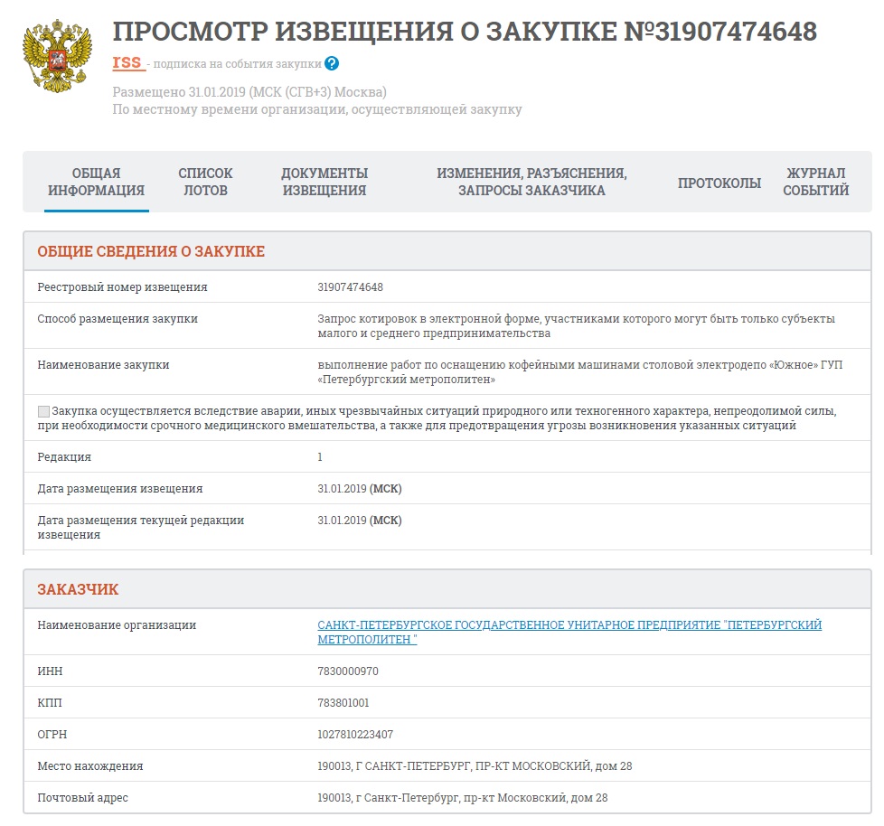 Интересный запрос котировок в электронной форме сегодня объявили: на выполнение работ по оснащению кофейными машинами столовой электродепо «Южное» ГУП «Петербургский метрополитен». Интересно, что заказчик - "САНКТ-ПЕТЕРБУРГСКОЕ ГОСУДАРСТВЕННОЕ УНИТАРНОЕ ПРЕДПРИЯТИЕ "ПЕТЕРБУРГСКИЙ МЕТРОПОЛИТЕН " . Как мы все знаем, это электродело еще не введено в эксплуатацию и не передано метрополитену. Сроки выполнения работ: Начало – 01.03.2019 г. Окончание – 20.03.2019 г. Интересно, если к этому времени депо не передадут метрополитену, как они будут работы принимать???