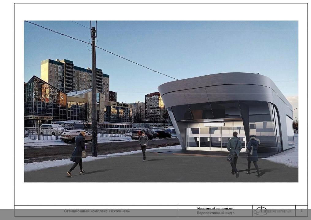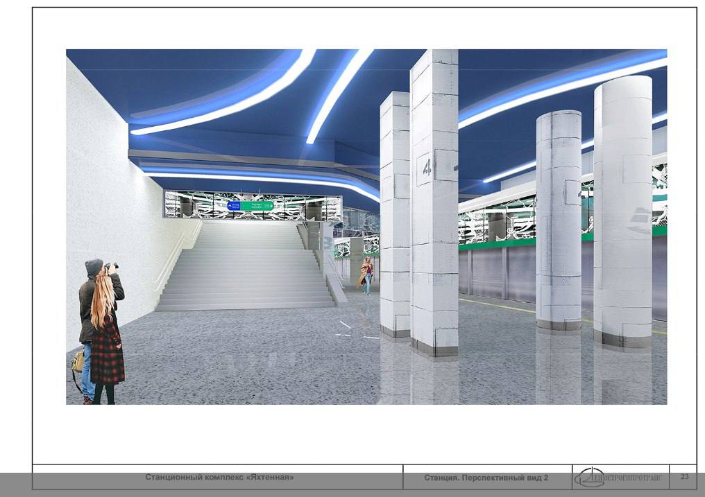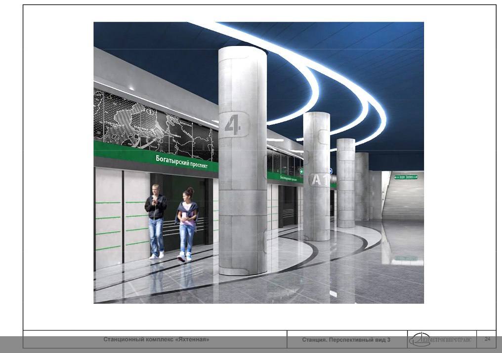 Первый — севернее перекрестка Туристской и Богатырского, там появится станция «Яхтенная». «В связи с глубиной расположения подходного тоннеля весь объем станции является подземным. — В подземном пространстве расположены пассажирские зоны: пешеходный переход, вестибюль и пассажирские платформы». Это значит, что вход на станцию будет происходить из подземного пешеходного перехода, а в него можно будет попасть по лестницам на обеих сторонах Туристской улицы, над каждой — павильон.