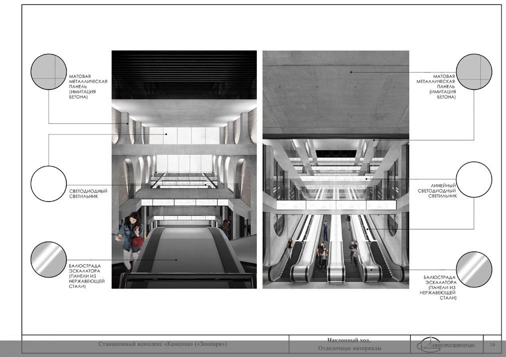 Вторая отсечка — это «Зоопарк», к которому линия завернет через Юнтолово, проскочив под ЗСД. Она, как и «Яхтенная» — мелкого заложения, на ней также четыре эскалатора. И вестибюль тоже будет находиться под землей, двери в него — через подуличный переход, который разместят под перекрестком Комендантского и Шуваловского проспектов.«Главным акцентом композиции по наземным павильонам и венткиоскам является парящий над открытым лестничным спуском навес, выполненный из металлического каркаса с отделкой из металлических монохромных панелей. Примыкающий к зоне входа венткиоск своей формой подчеркивает динамичную форму входной композиции».