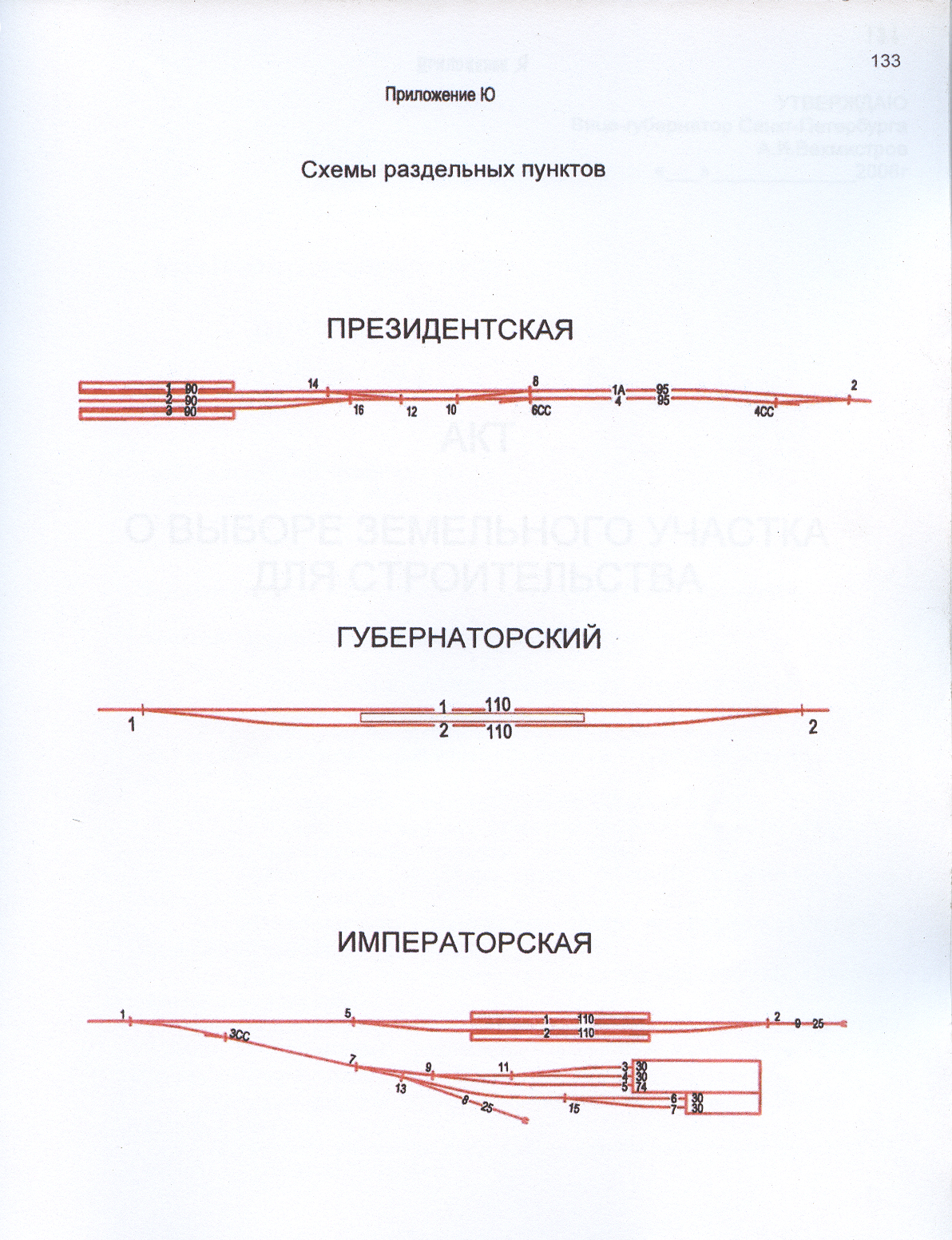 В районе южного выхода из метро Купчино будет сооружен пешеходный мост над галереей метро, ведущий к начальной станции и вокзалу Президентская. Стация Президентская будет тупикового типа (как станция Санкт-Петербург Главный - Московский вокзал), состоящая из 3-х приемо-отправочных путей на вокзале (в т.ч. 2 - с пассажирскими платформами) и 1-го отстойного (обгонного) пути. Напротив о.п. Шушары расположится разъезд Губернаторский, состоящий из 1-го главного и 1-го приемоотправочного путей с островной пассажирской платформой между ними. Раздельные пункты Президентская и Губернаторский оснастят микропроцессорной системой централизации стрелок и сигналов ЭЦ-ЕМ, а перегон между ними - полуавтоматической блокировкой системы РПБ ГТСС с ЭССО. В вокзале станции Президентская будет находится единый пост ЭЦ Президентская-Губернаторский с 2-мя отдельными кабинетами ДСП и кабинетом ДНЦ, оборудованным диспетчерским контролем. В районе о.п. 21 км устраивается конечная станция Императорская с 2-мя сквозными приемо-отправочными путями и островной платформой, 1-м тупиком для оборота локомотивов и 6-ю деповскими путями (5-ть путей в ангаре, в т.ч. 3 - для отстоя вагонов, 2 - для отстоя локомотивов и 1 - снаружи для экипировки). В вокзале станции Императорская будет находится пост ЭЦ для управления маршрутно-релейной централизацией системы ЭЦ-12-2003, причем для обучения "южиков" стрелки на деповских путях останутся нецентрализованными. Перегон Губернаторский-Императорская длиной 7 км оборудуется также РПБ ГТСС с ЭССО. Руководство Октябрьской ж.д. пошло навстречу длительным уговорам проектировщиков и согласилось применить различные устройства СЦБ на станциях, но оснастить длинный перегон автоблокировкой АБТЦ категорически отказалось, мотивируя это возможным хищением кабеля и разбитыми проходными светофорами. Конечно, это большой минус в графике движения поездов, т.к. в условиях неидентичности по времени хода перегонов, оборудование их только полуавтоматической блокировкой исключает пакетное движение. Кстати, все пассажирские платформы на дороге будут низкими, размером 3х80 м. Такова будущая Малая Октябрьская ж.д.