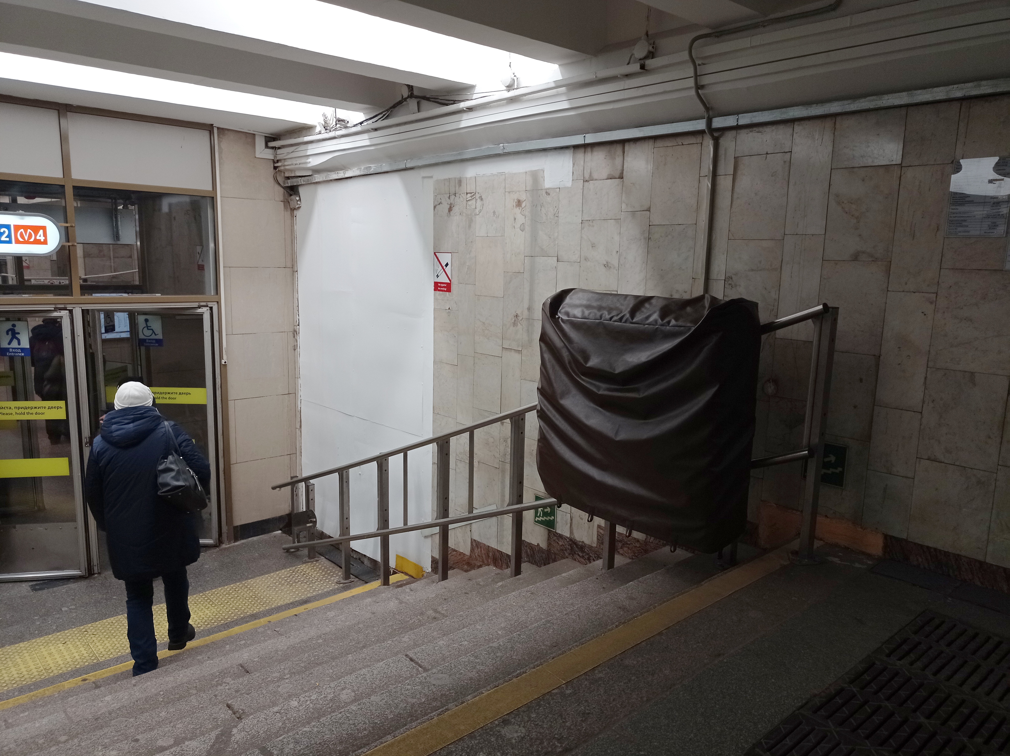 У входа в вестибюль проблемный участок стены залотали металлическими пластинами, у двух северных выходов, а именно в соединяющего коридора, огородили участок, с которого видны водопроявления.
