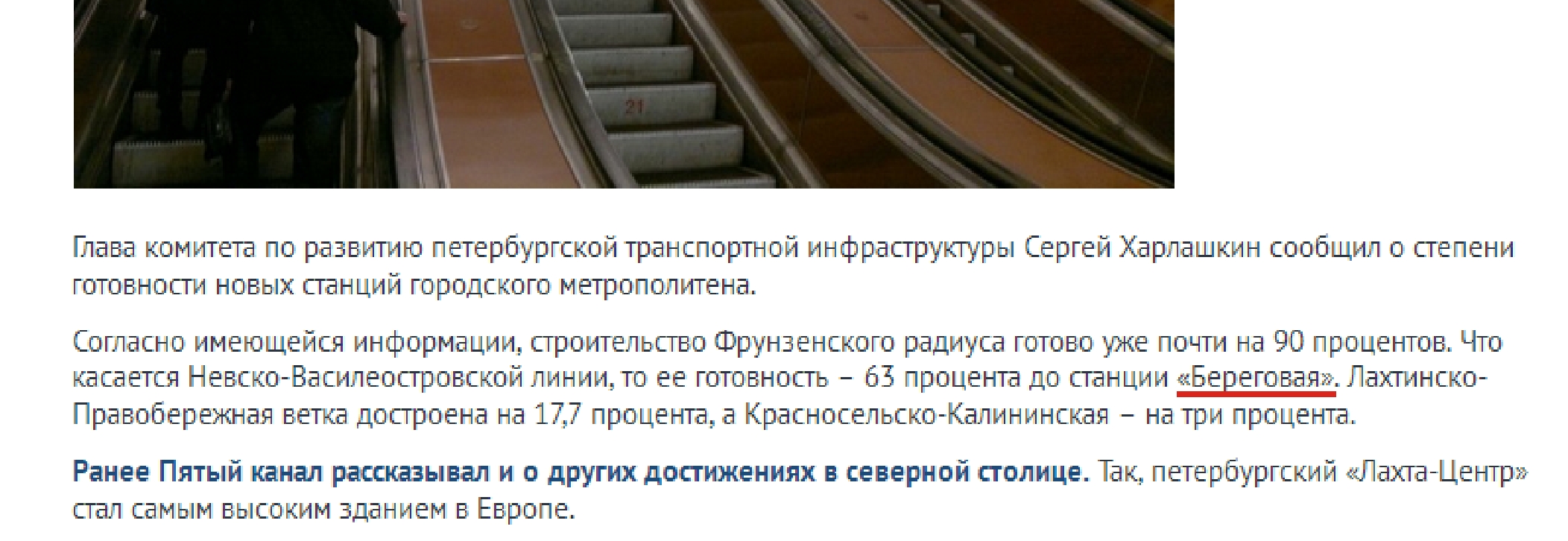 И вообще, как можно выражать готовность станции/линии/депо в процентах? Остекление на том же ЛЦ я могу понять, там известно требуемое и установленное количество панелей. А тут: эскалатор, это сколько процентов? А один рельс?