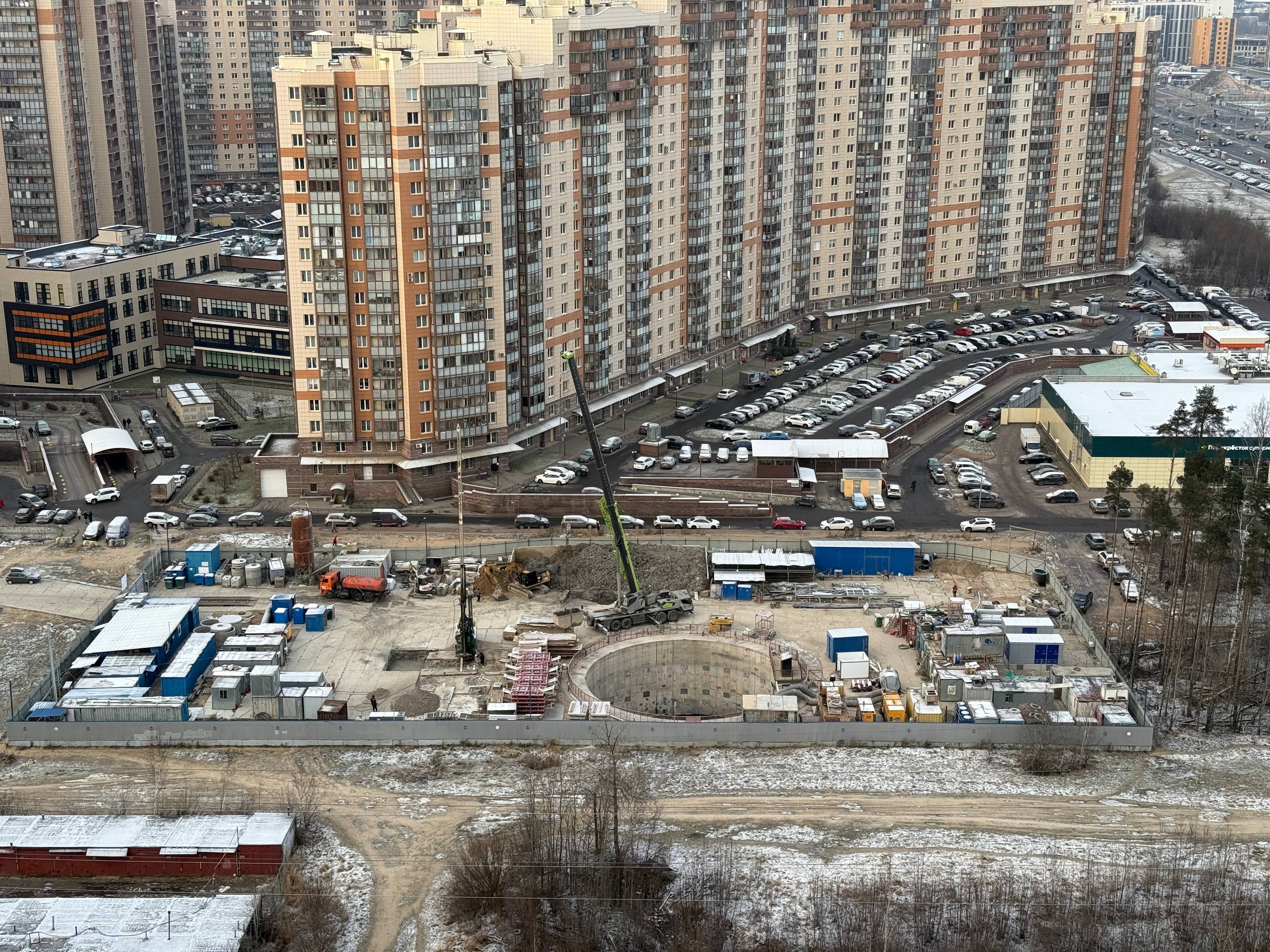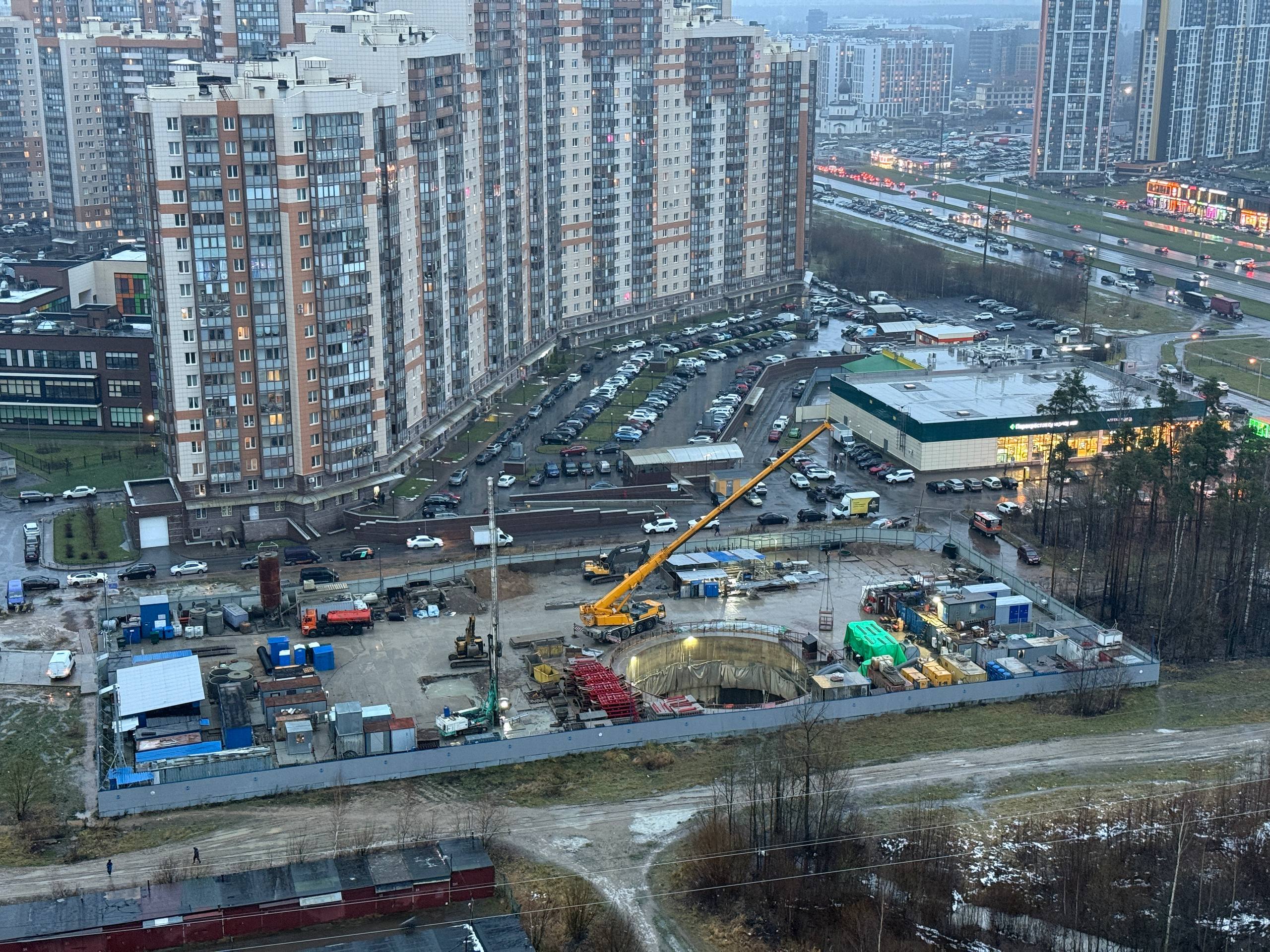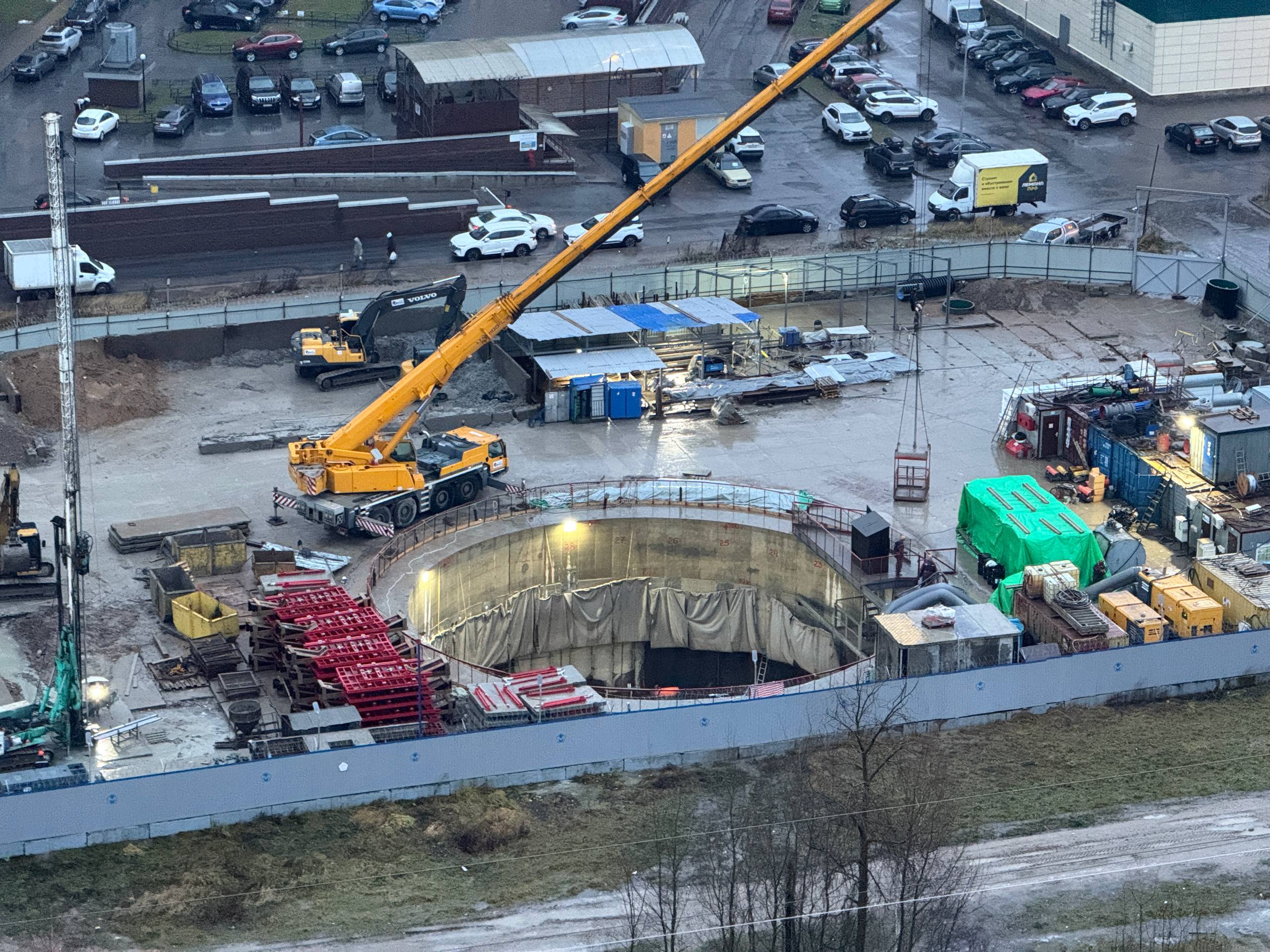 На участке Шуваловского проспекта между проспектом Королёва и Парашютной улицей, активно идут работы по сооружению ограждающей конструкции демонтажного котлована для ТПМК «Надежда».