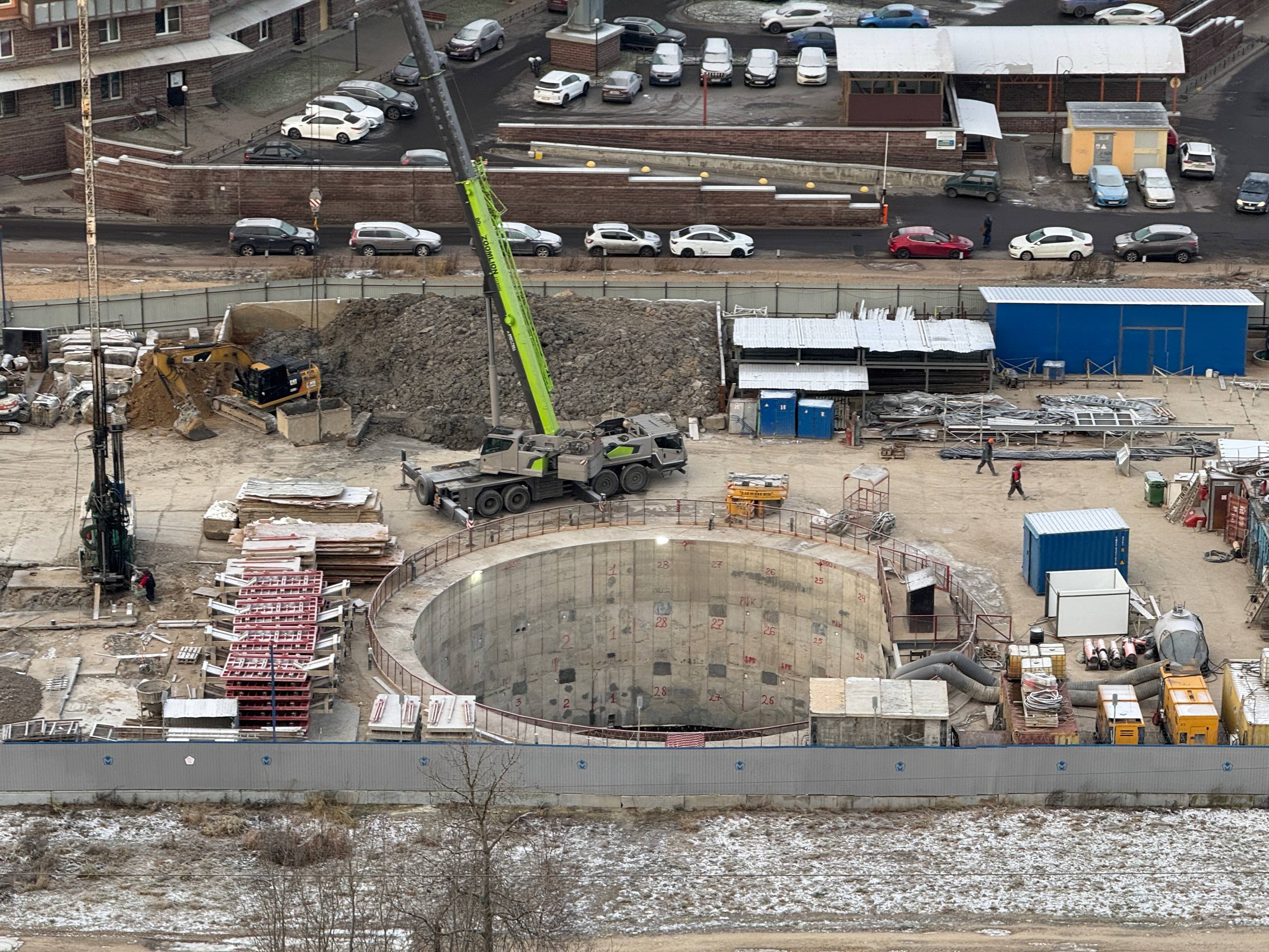 Сделано 76 проектных буросекущих свай. Идут работы по разработке грунта внутри котлована, его глубина составит ~ 35 метров. Выполнено армирование и бетонирование обвязочной балки по периметру котлована и первой захватки из двенадцати. Разработан грунт для второй захватки. Сейчас глубина котлована ~ 7 метров. После разработки грунта забетонируется внутренняя стена по контуру свай.
