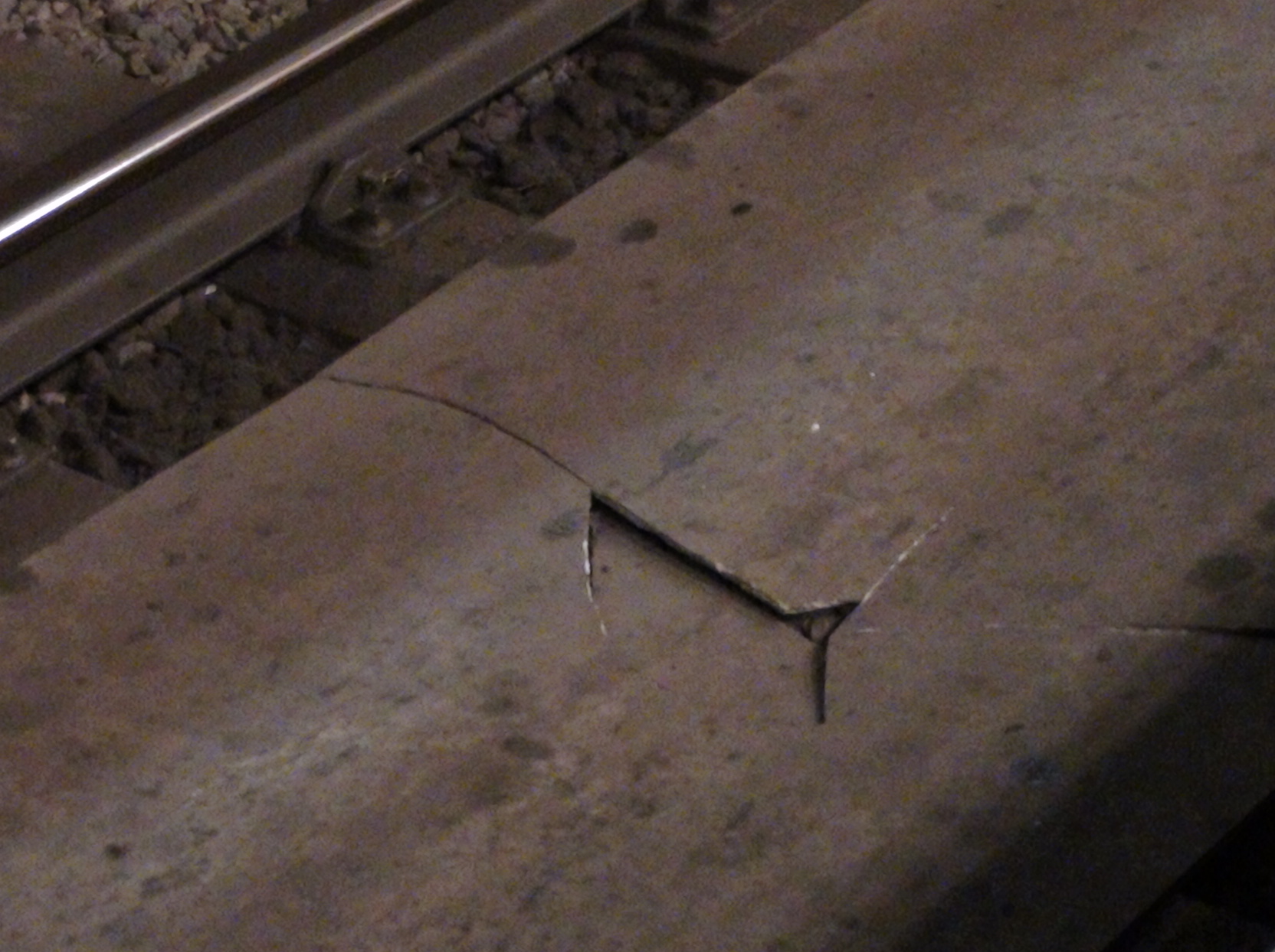 На Парнасе, на 2-м пути обнаружил пробоину. Ощущение, что туда кто-то упал с платформы и пробил собой (гипрок???). Насколько известно, Парнас, одна из немногих станций, где нету канавки вдоль рельс. Каким образом образовалась пробоина?