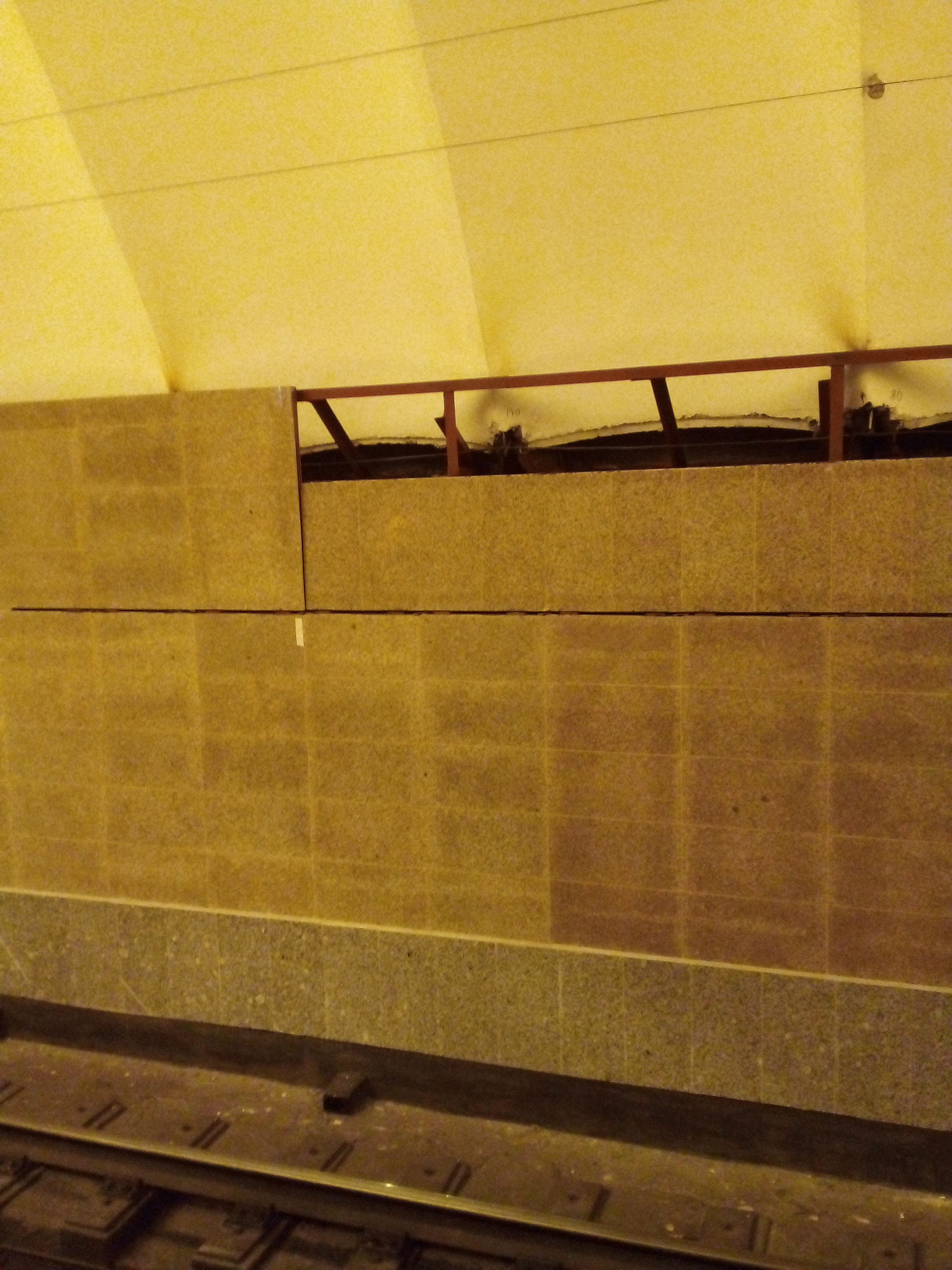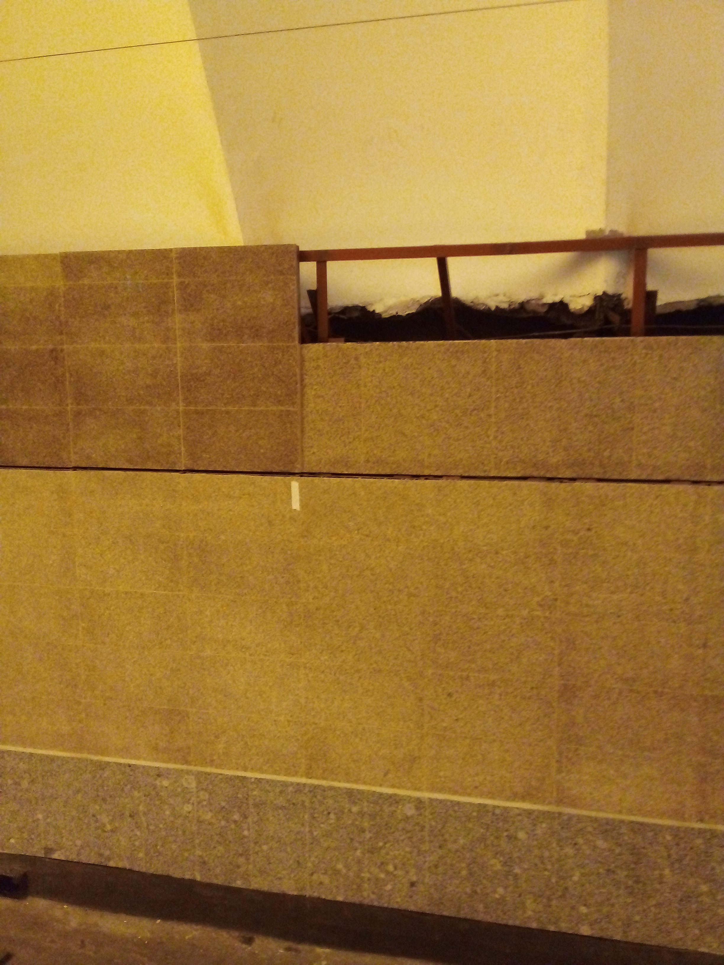 В общем, как я и подозревал, новая отделка предполагает не только несоответствие цветовой гаммы, но и совершенно другой формат надписи на путевых стенах. Вместо наклонной верхней панели путевой стены монтируется вертикальная, строго совпадающая с нижней панелью. В местах, где должна быть надпись, делается уступ в толщину одной плитки, панель остается вертикальной (как будет "замазан" этот уступ - пока не понятно, но судя по всему, ничего качественного ожидать не приходится).