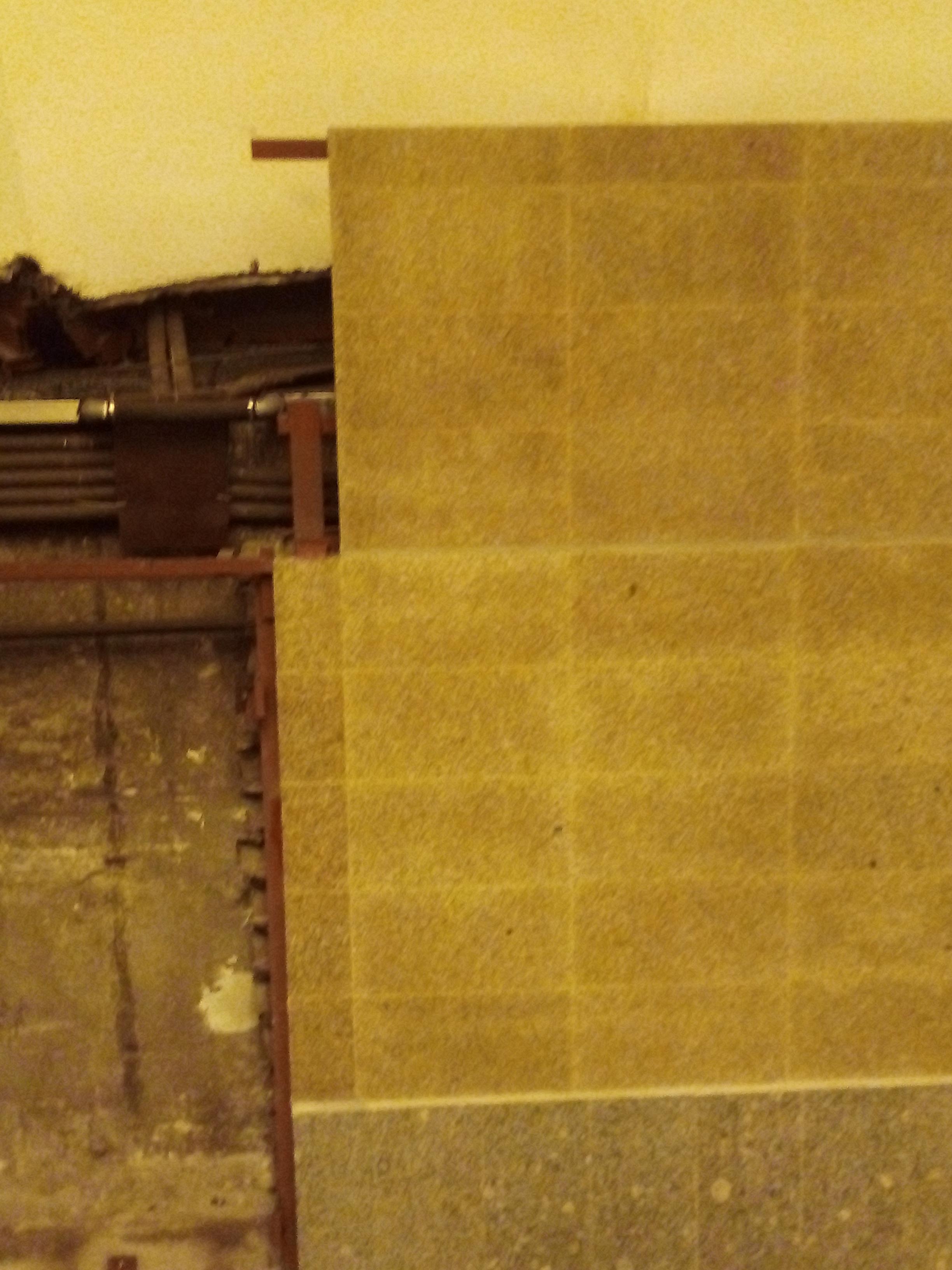 Я-то думал, какое техническое решение будет для вот этого уступа снизу, где буквы должны быть (где, по идее, вообще не должно быть уступа за счет наклона верхней части стены, если брать оригинал)? А никакого технического решения! Замазали - и всё. И подозреваю, что это самая обычная копеечная замазка для кафельных плиток для бытовых нужд, которая в строительных магазинах продается.