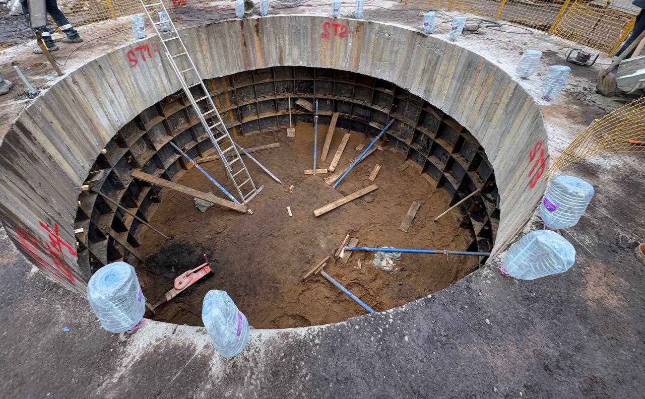 Приступают к проходке ствола шахты: разработан грунт внутри первой заходки, установлена опалубка и забетонирована первая заходка, то есть: пространство между внутренней стеной буросекущих свай и опалубкой.