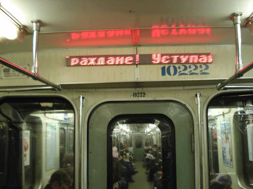 Работали "бегущие строки"... Я надеялся, что на них будут писать названия станций, но там бегало лишь два сообщения: "СПб метрополитен желает Вам приятной поездки..." (читалось как издевательство в переполненном вагоне в час "пик") и "Уступайте места... не забывайте вещи... обращайтесь к машинисту по связи или дежурным по станции".