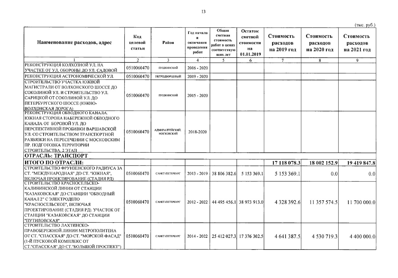 - уменьшено финансирование в 2019 году строительства участка "Казаковская"-"Путиловская" с 6,453 до 4,328 млрд. руб.;