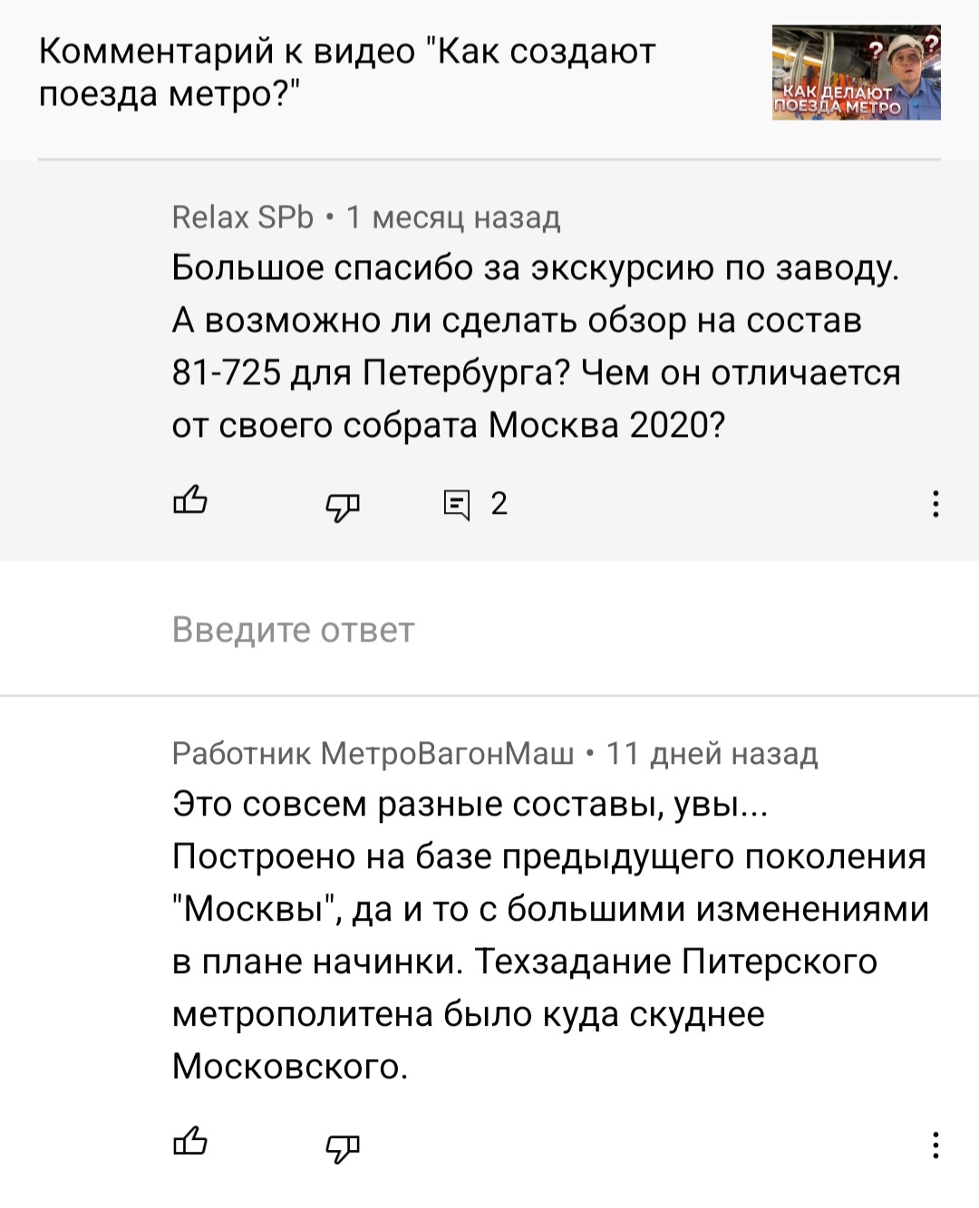 Про состав для Петербурга задал вопрос в комментарии под видео. На вопрос ответил человек, представившийся работником МетроВагонМаша. Честно признаюсь, стало немного грустно... Но спасибо ему за разъяснение. Ответ прикладываю...