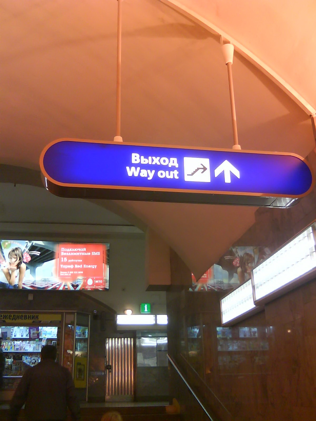 Кстати, обратил внимание, что указатель, висящий над входом в тоннель от четырехленточного эскалатора к выходу на Грибанал, подвешен плохо. И в ближайшее время он может наLevAndнуться прямо на пассажиров.