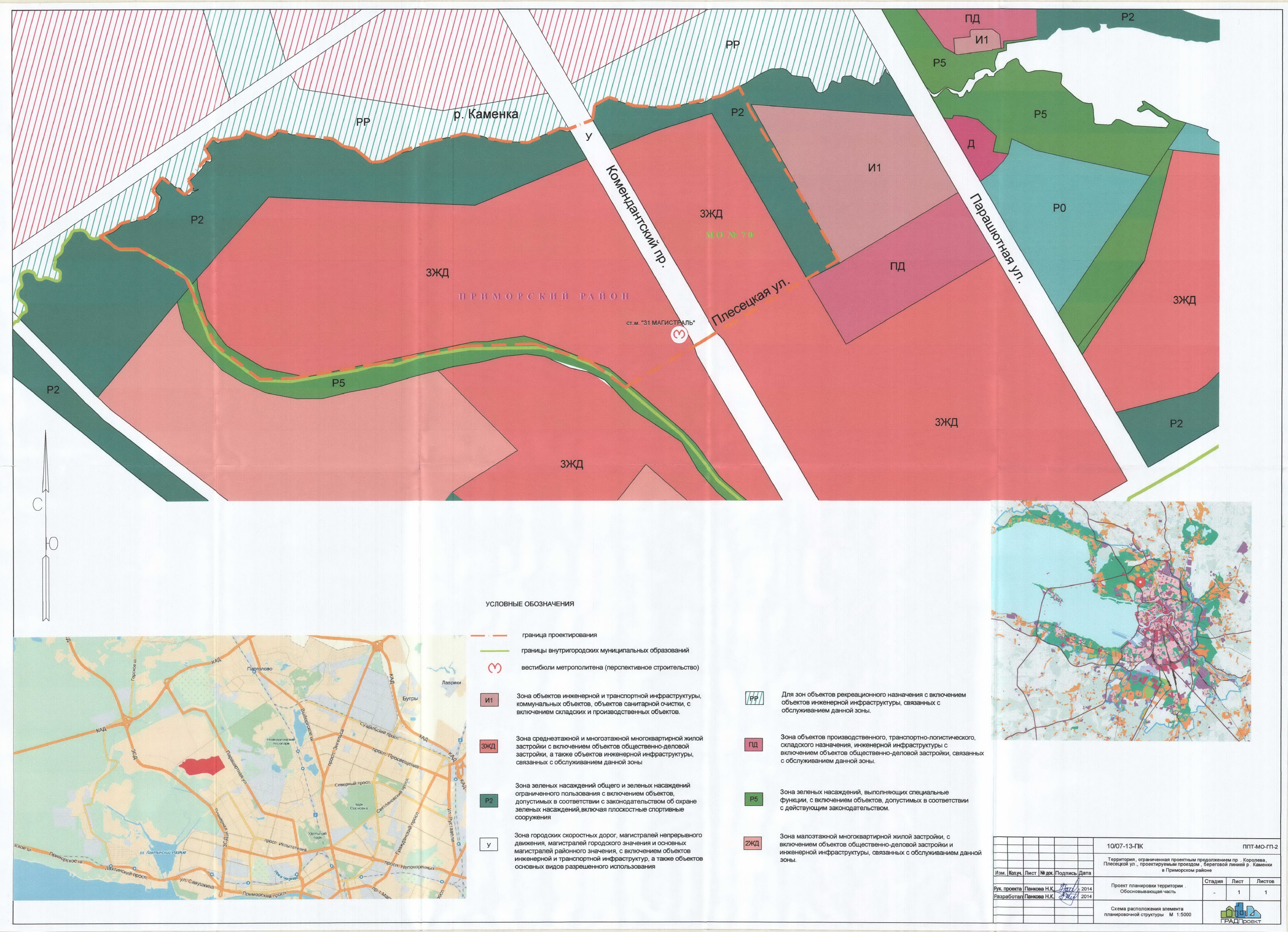 Участок под перспективное строительство станции "Магистраль № 31" утвержден постановлением Правительства Санкт-Петербурга (далее - ПП СПб) от 22.12.2014 г. № 1213 "Об утверждении проекта планировки с проектом межевания территории, ограниченной проектным продолжением пр. Королева, Плесецкой ул., проектируемым проездом, береговой линией р. Каменка, в Приморском районе". Схемы из обоснований к проекту планировки территории: