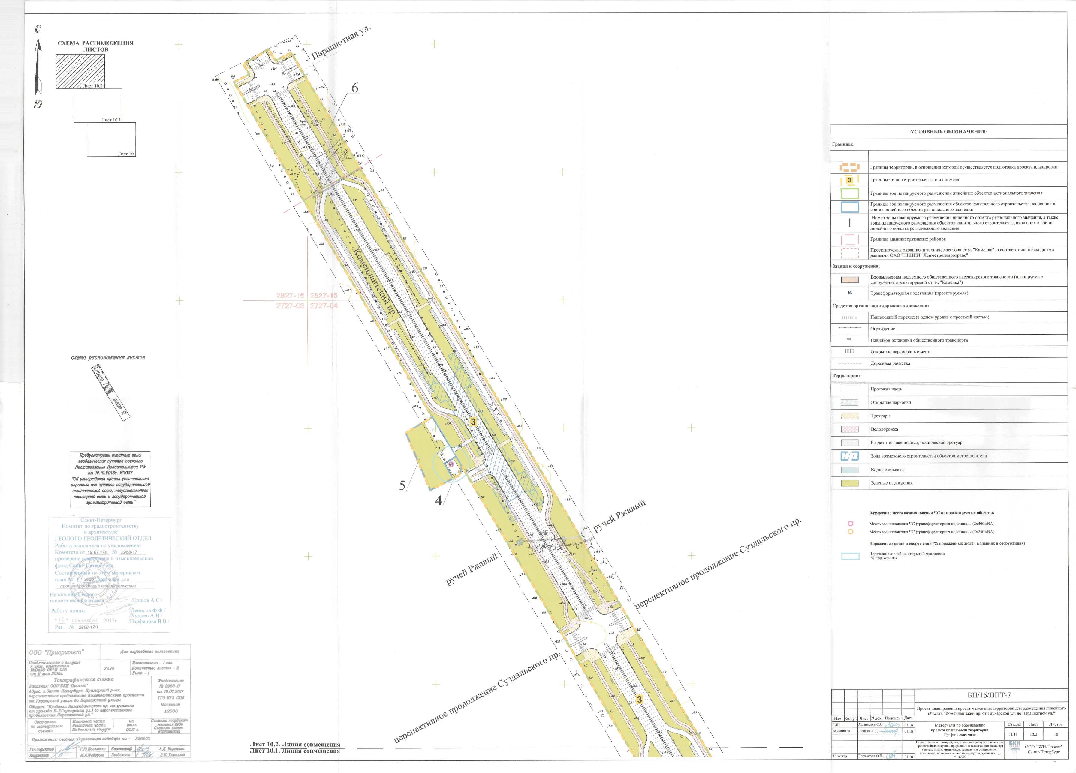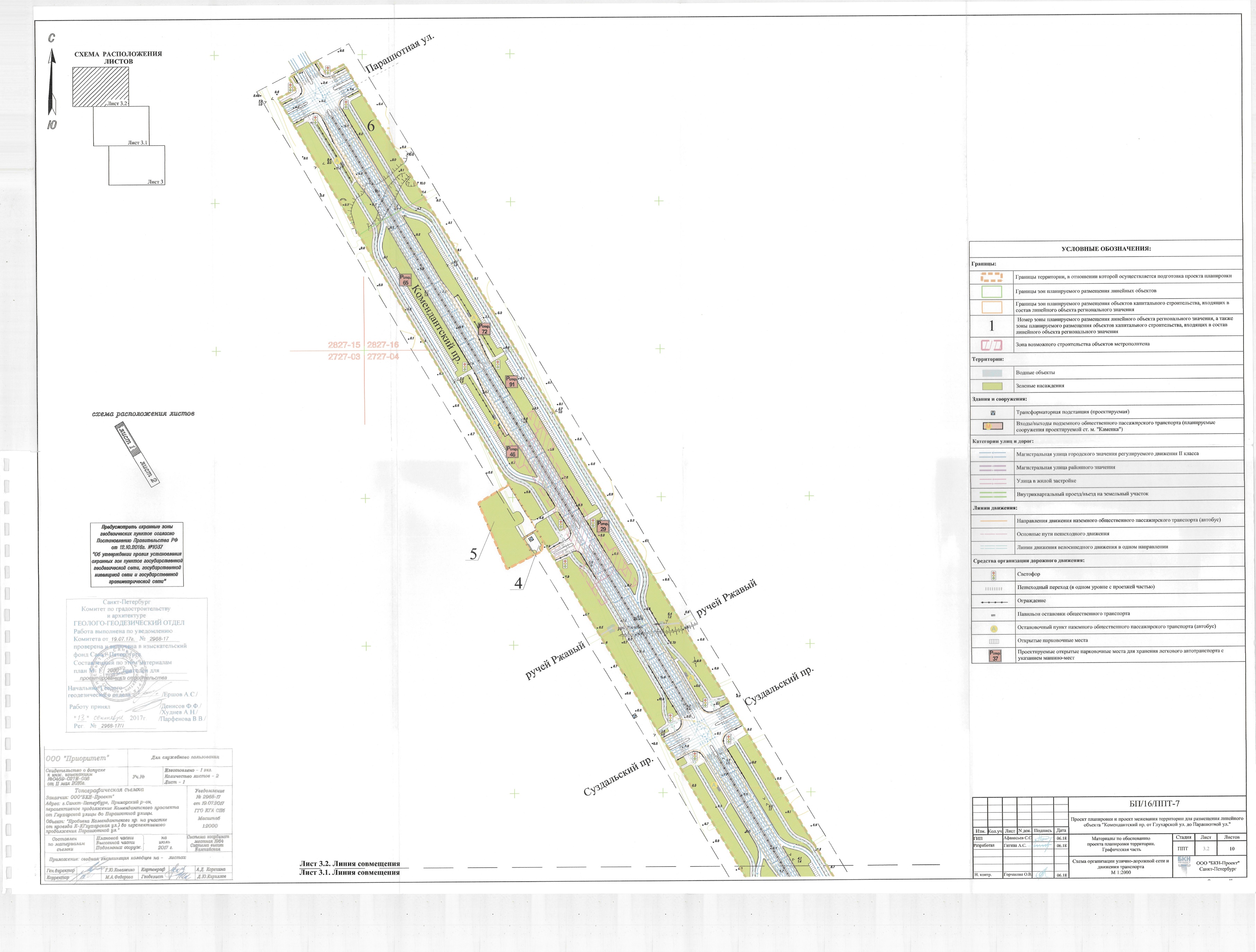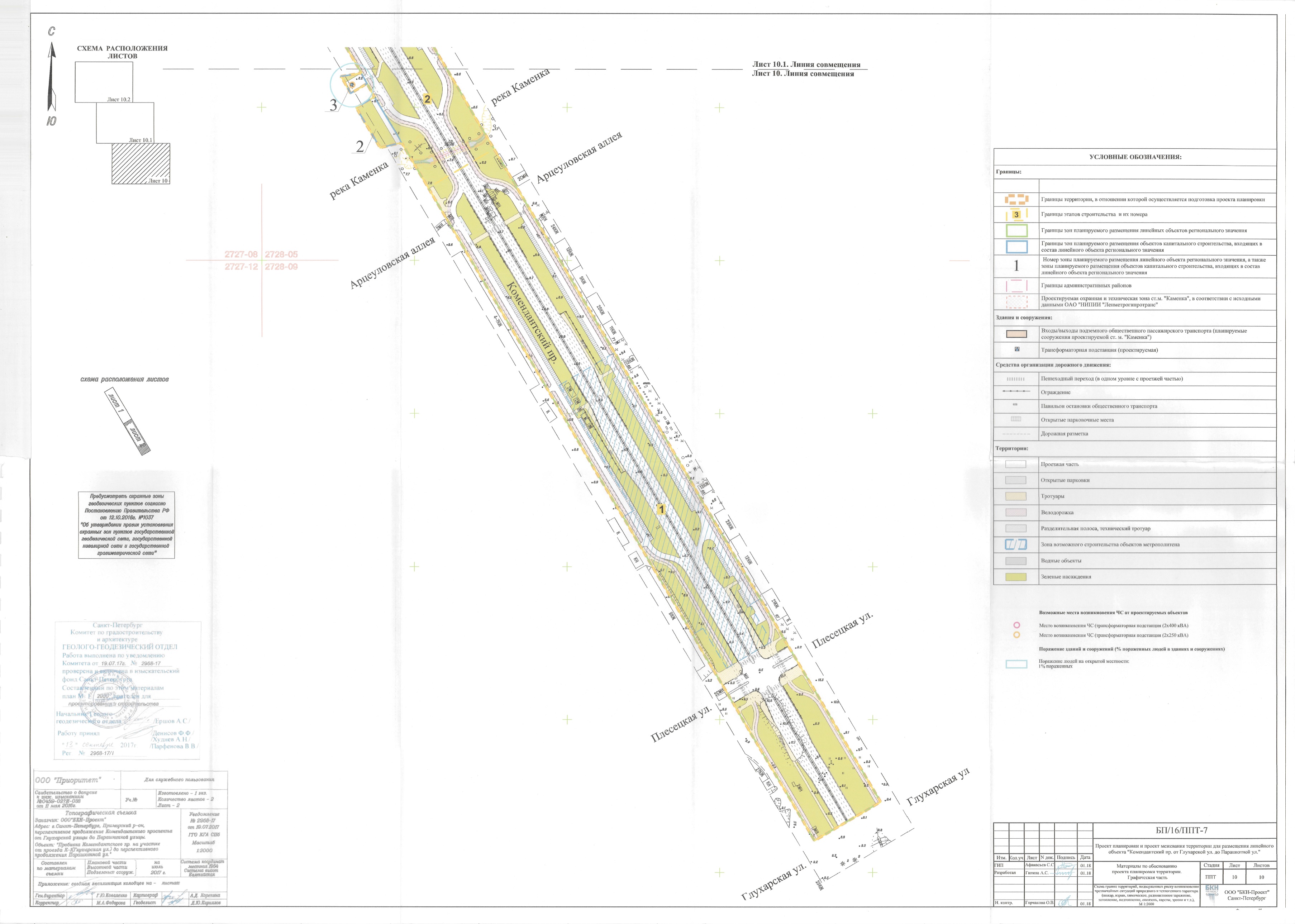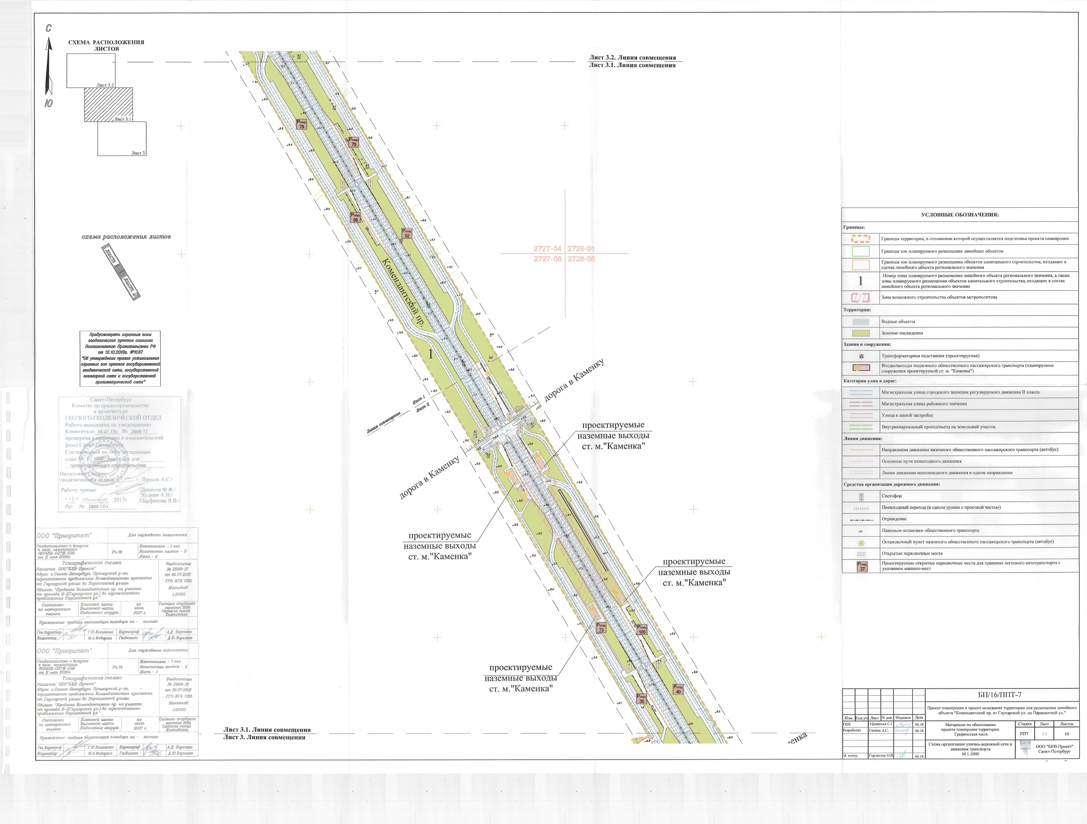 В соответствии с ПП СПб от 12.11.2019 г. № 785 "Об утверждении проекта планировки с проектом межевания территории для размещения линейного объекта регионального значения "Командантский пр. от Глухарской ул. до Парашютной ул." обозначены участки и местоположения всех трех станций: "Магистраль №31", "Каменка ", "Коломяжская". Однако, только участок и вестибюли ст. "Каменка" обозначены как утвержденные, а участки под ст. "Магистраль №31" и "Коломяжская", как "зона возможного строительства объектов метрополитена". Схемы из обоснований к проекту планировки территории: