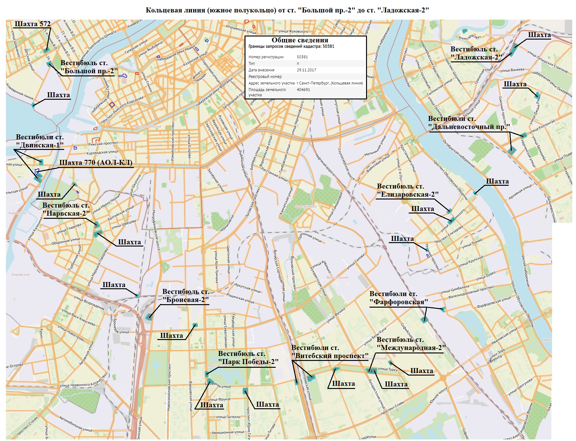 Для строительства южного полукольца Кольцевой линии от станции "Большой пр.-2" до станции "Ладожская-2" в 2017 году были зарезервированы следующие площадки: