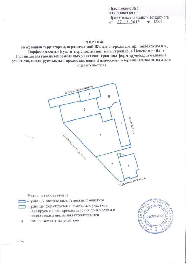 Участок под восточный вестибюль станции "Фарфоровская" утвержден постановлением Правительства Санкт-Петербурга от 27.11.2012 г. № 1241 "Об утверждении проекта планировки с проектом межевания территории, ограниченной Железнодорожным пр., Белевским пр., Варфоломеевской ул. и перспективной магистралью, в Невском районе". Схемы из постановления и обоснований к проекту планировки территории: