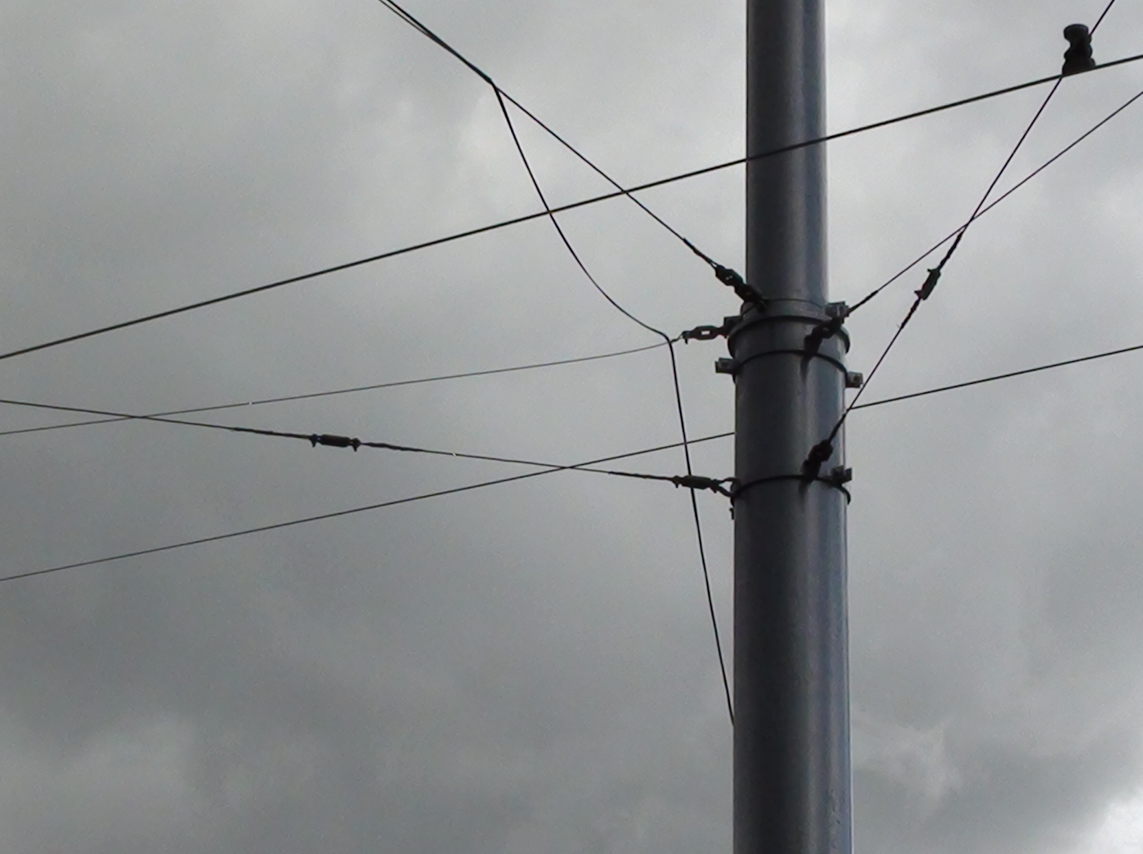 Сегодня снова там был. Ощущение, что в КС. На среднем снимке тянется снизу вверх, задевая какой-то ещё провод. След заканчивается на какой-то связке (самое верхнее фото, идёт с верхнего правого угла к кружку и всё, дальше провода больше нет). Кстати, этот кружок соединяет две действующих КС трамваев. Точнее не понять куда. Судите сами по фоткам: