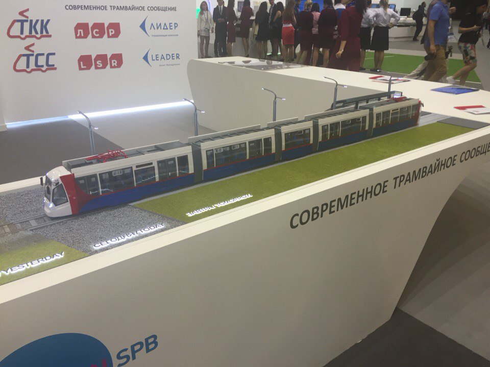 статье Фонтанки про ПМЭФ-2016 увидел фото странной модельки трамвая. Никак не мог понять, что у вагона за вторая секция. Для привычно короткой (2 окна) не вижу второго сочленения, и вообще снизу что-то непонятное, похожее на кожух тележки у самого сочленения. Но для четырехосной секции, как у Песы Твист, следующий кожух далековато, даже если бы там была база 7.5, а не как у Твиста. Дополнительный вопрос вызвала надпись ТСС, "с"-ы которой никак не мог расшифровать.