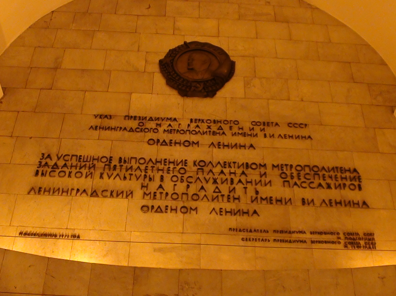 Интересно, планируется ли убрать когда-нибудь витраж о том, что Ленинградский метрополитен наградили орденом ленина? Уже давно не актуально, и даже немного странно в XXI веке видеть такое. К тому же, исторического ничего в этом нет. Каждый Советский метрополитен ужно было назвать "Метрополитен им. Ленина". А предлог был - выполнение пятилетки...