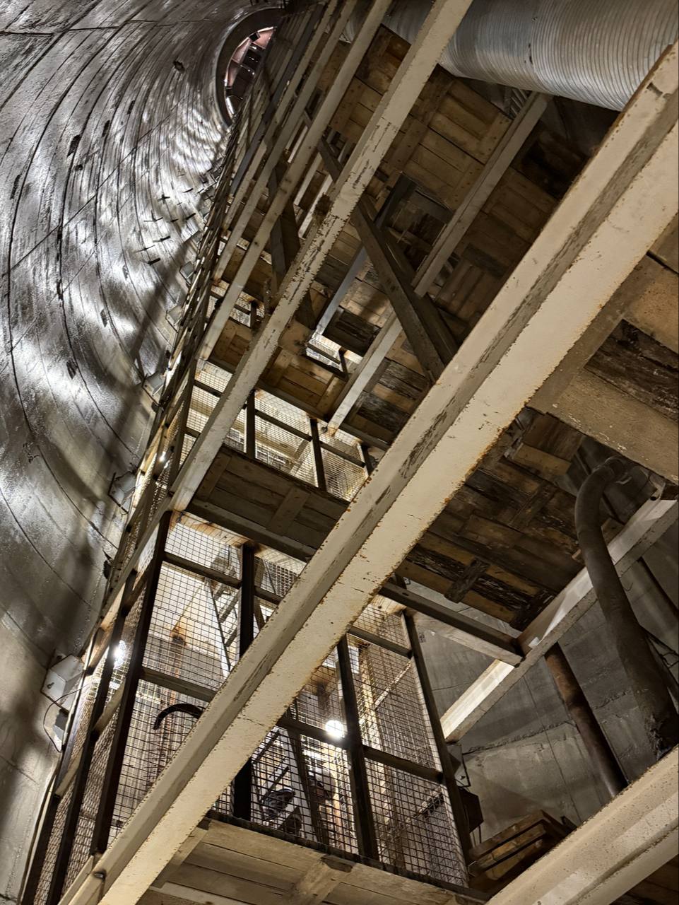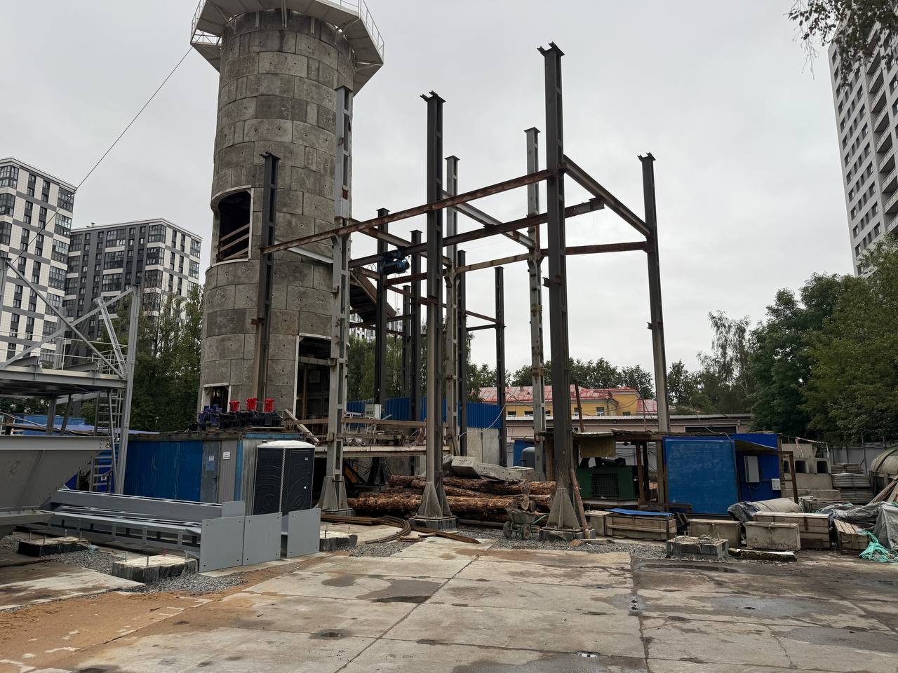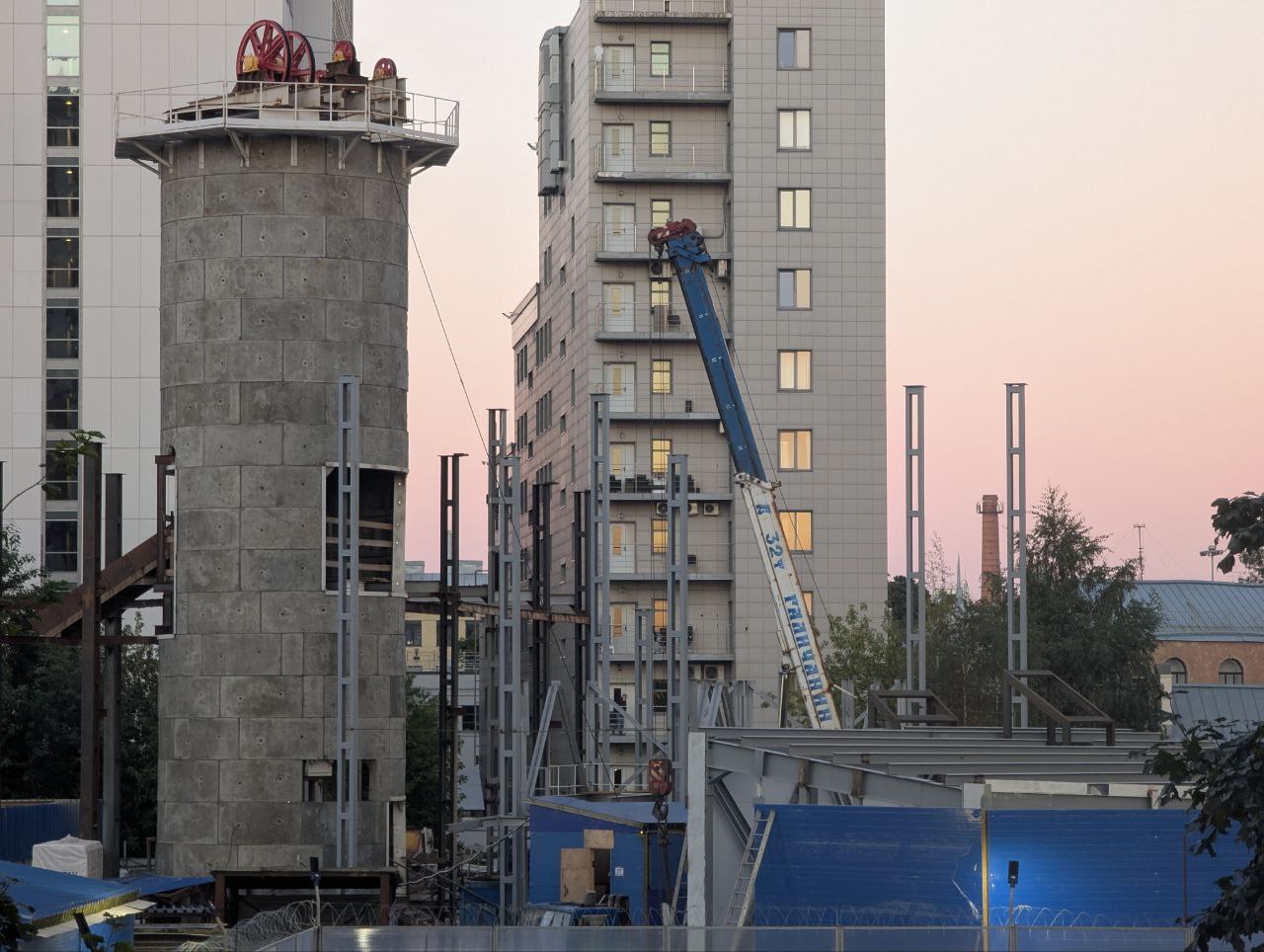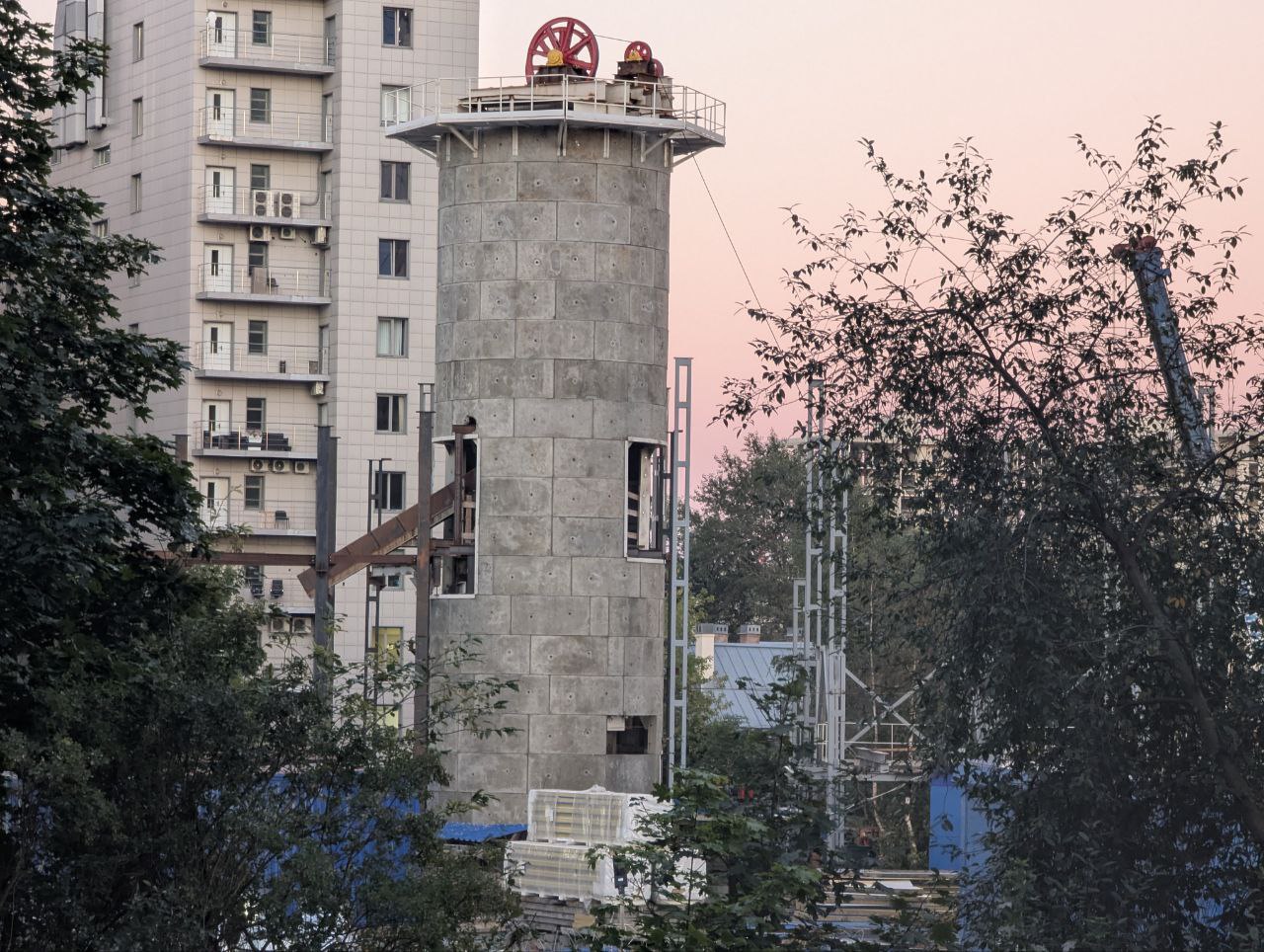 Здесь продолжается устройство здания горного комплекса. Предположительно оно должно быть готово уже к концу осени 2025 года. На площадке уже установлен подъёмный механизм клети.