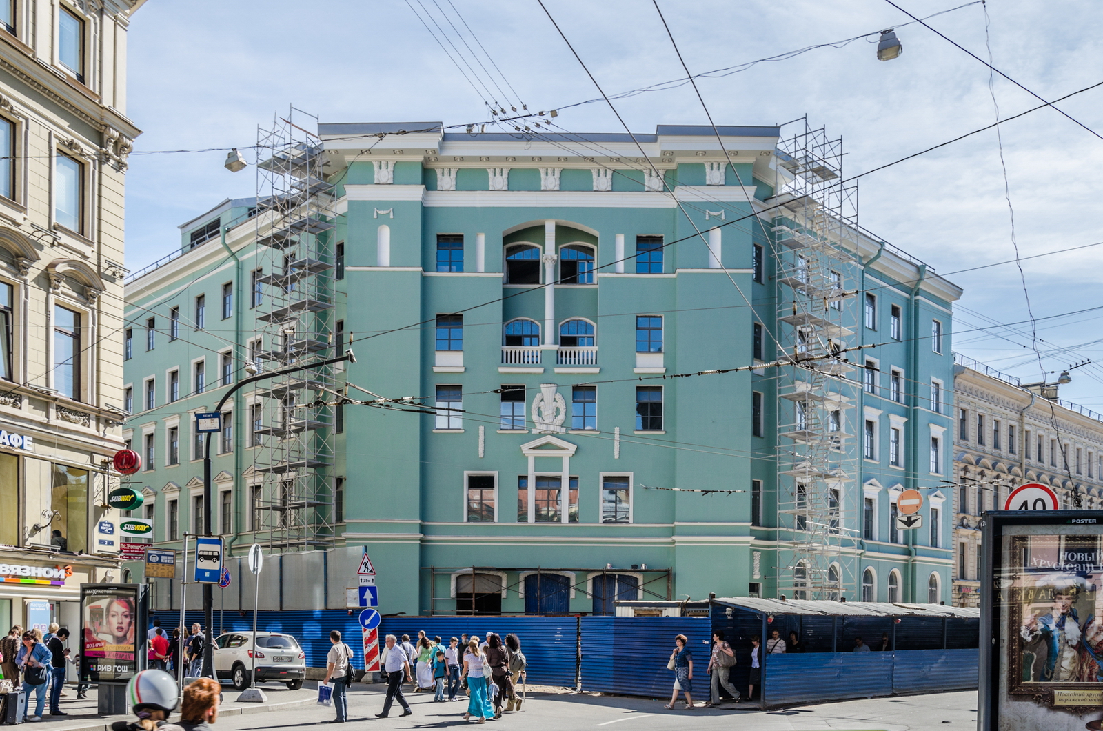 а по делу: сегодня выстроили леса до крыши на углу м. Морской, видимо что то задумали делать с карнизом, но почему не с люльки этим заниматься, непонятнооо...