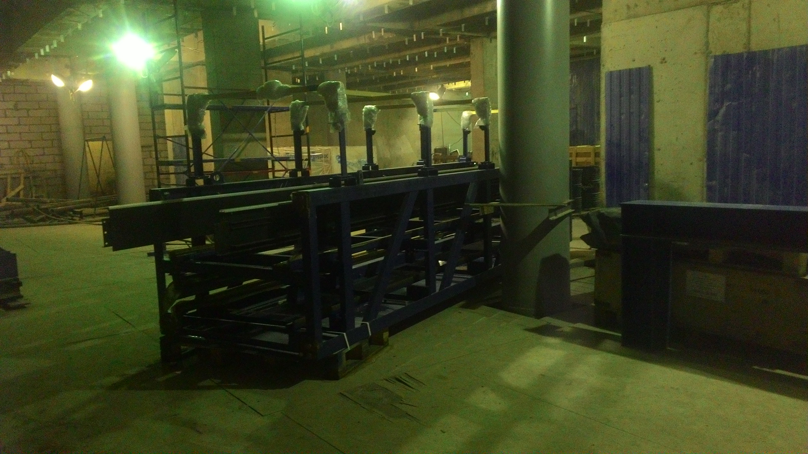 На этой же отметке, в помещениях тягово-понизительной подстанции (ТПП) «Девятка» опускает электротехническое оборудование: выпрямительные агрегаты, кабель, автоматику, секции шин, фидеры, замыкатели, распределительные устройства, трансформаторы силовых и осветительных нагрузок. Идет монтаж сложной системы энергообеспечения. Как и на любой другой подземной ТПП, на случай сбоя напряжения здесь устанавливаются мощные аккумуляторные батареи для аварийного питания систем управления, сигнализации и освещения. Запустить ТПП, то есть оживить «сердце станции» – это сейчас, пожалуй, самое главное. До новогодних праздников руководство СМУ №13 даже организовало специальную бригаду, обеспечивающую работу «Девятки» в ТПП. И уже второго января на площадку «Беговой» пошли машины с электрооборудованием для подстанции. Еще один важный момент (Игорь Евгеньевич уверенно ведет корреспондентов по узким дощатым настилам): у нас построены фундаменты под монтаж эскалаторных систем. Смотрите, с левой стороны станции началась подготовка к сборке эскалаторов: монтажники «Девятки» готовят такелаж, монтируют транспортную балку и т.д. На платформу «Беговой» пассажиров будет доставлять два эскалаторных спуска.