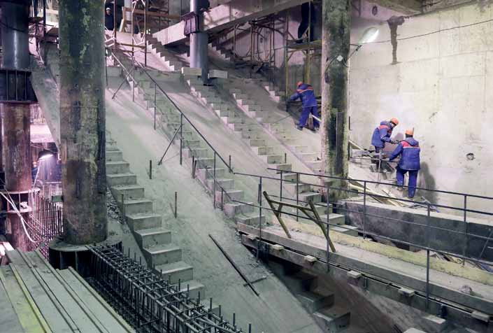 Строительство пассажирской платформы только начинается. Возводится опалубка, вяжется арматура, захватками по 10-20 метров заливается бетон. Одновременно с платформой строится армированный каркас разделительной межплатформенной стены. Платформа должна быть готова в феврале. Как утверждает Игорь Евгеньевич, все предстоящие операции будут производиться быстро и практически единовременно, от центра платформы (ось 6-7) в противоположных направлениях. В первую очередь будет обустроен ж/б конструктив (стены подплатформенных помещений и сама плита платформы). Следом за платформой начнется бетонирование жесткого основания, укладка путевого бетона, монтаж рельсовых путей, отделка, и, наконец, монтаж инженерных систем. Работы еще очень много, поэтому держать высокие темпы на платформенном участке крайне важно.