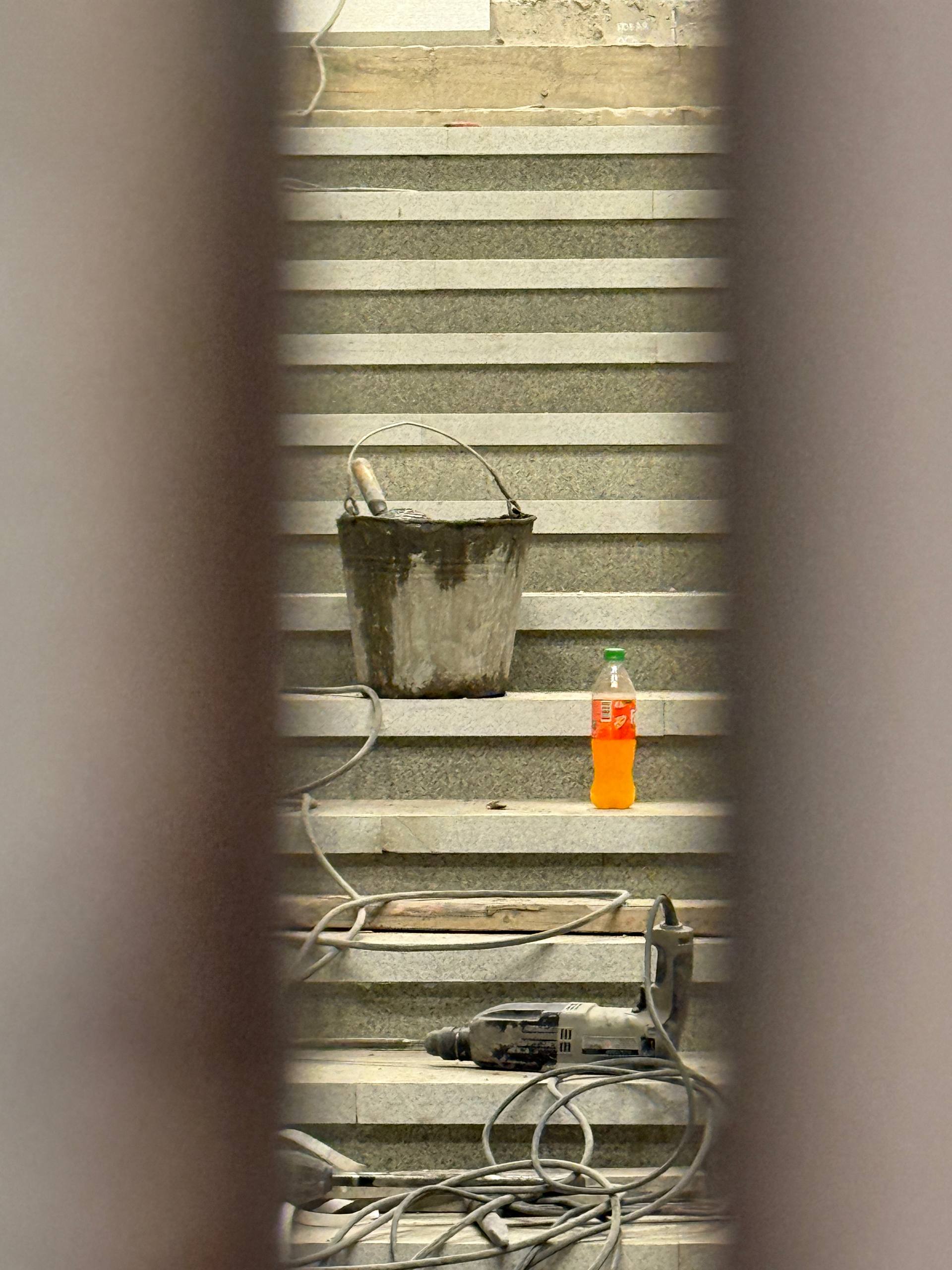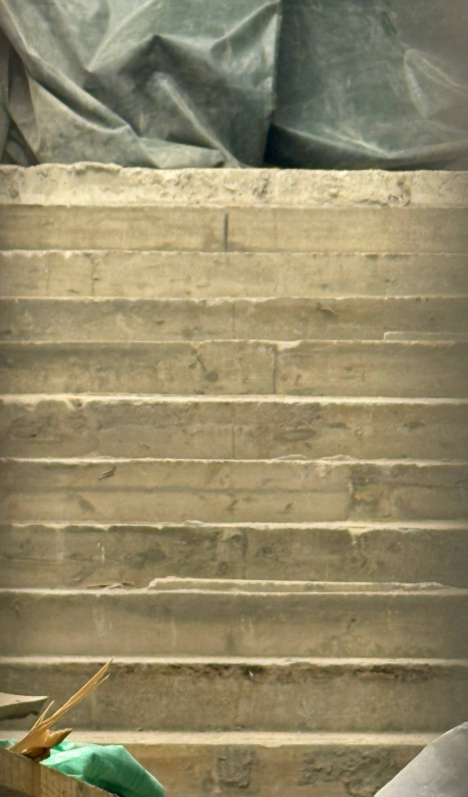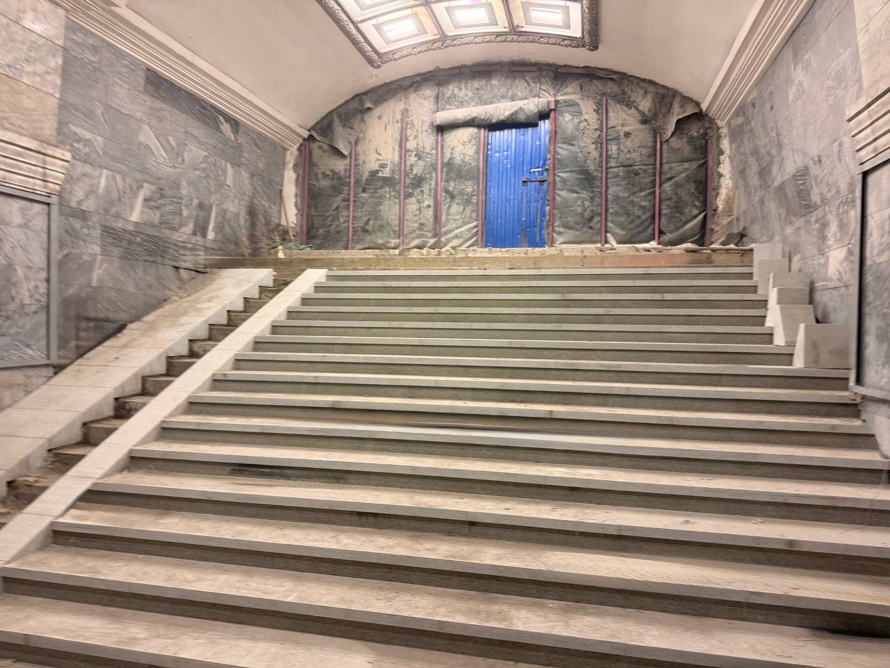 Завершается облицовка лестничного марша плитами из натурального камня. Этот марш ведёт из центрального зала станции «Кировский завод» к подходному коридору, который соединяется с малым наклонным ходом.