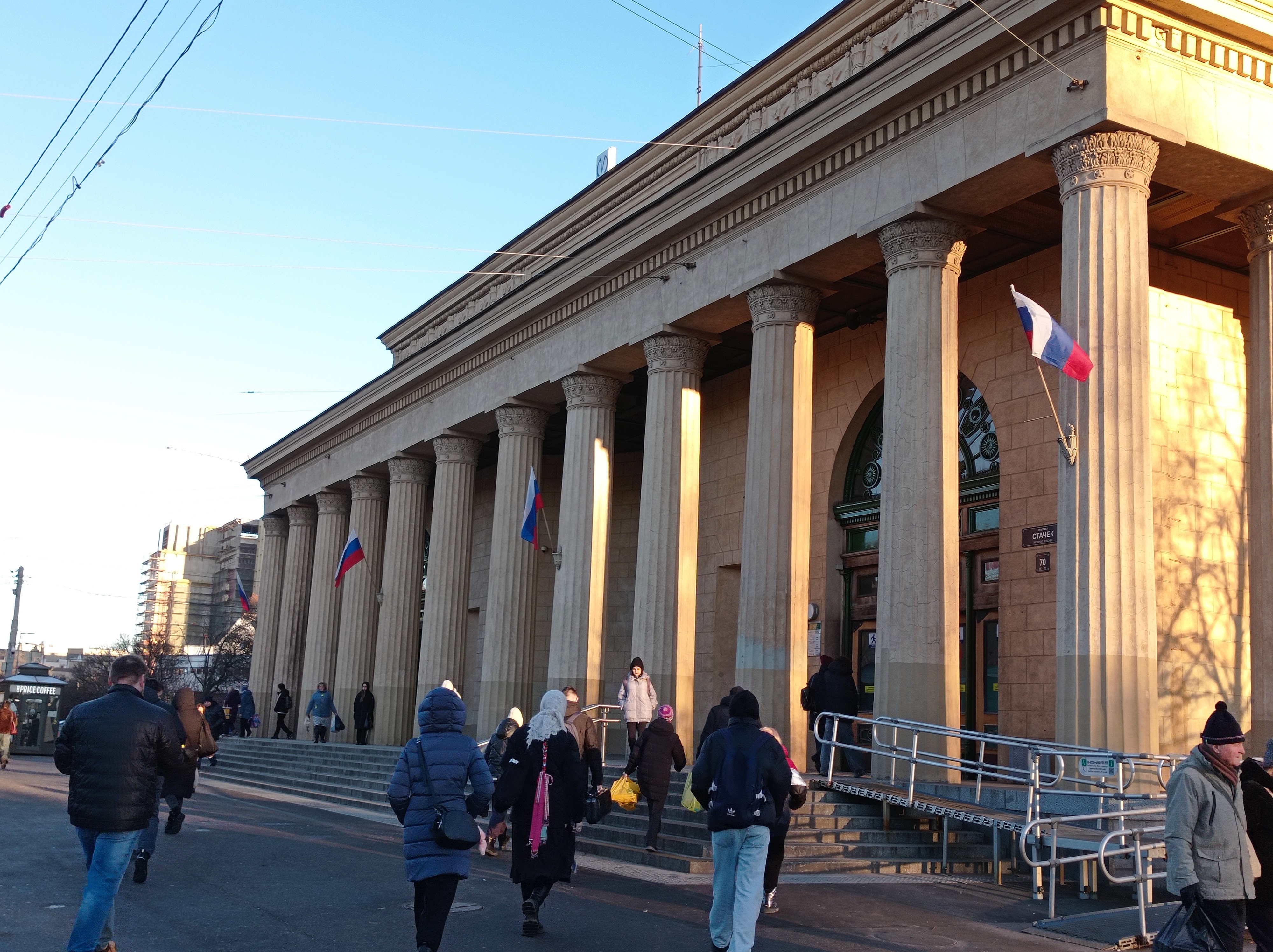 На колонны повесили российские флаги. Мне кажется что Беглов будет здесь выступать, раз уж их вывесили.