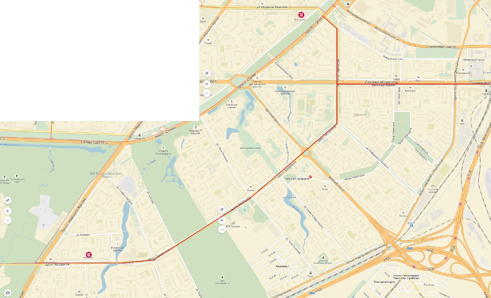 Вот карта. Кстати, пр. Ветеранов довольно широкий. Там бы поместился трамвай без особых помех. А далее ещё удобнее разместился бы по Ленинскому пр. до Московской. Один маршрут в сторону центра, другой в сторону Купчино.
