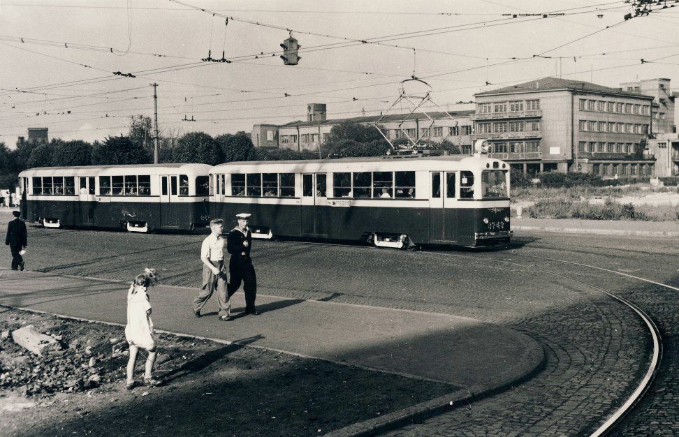 Трамвай поворачивает с проспекта Стачек на улицу Новостроек (Кронштадтскую). Тот момент, когда метро уже открыли, мимо "Кировского завода" трамвай еще ходит, а вот мимо "Автово" - уже в объезд. Датировано 1957-ым годом.