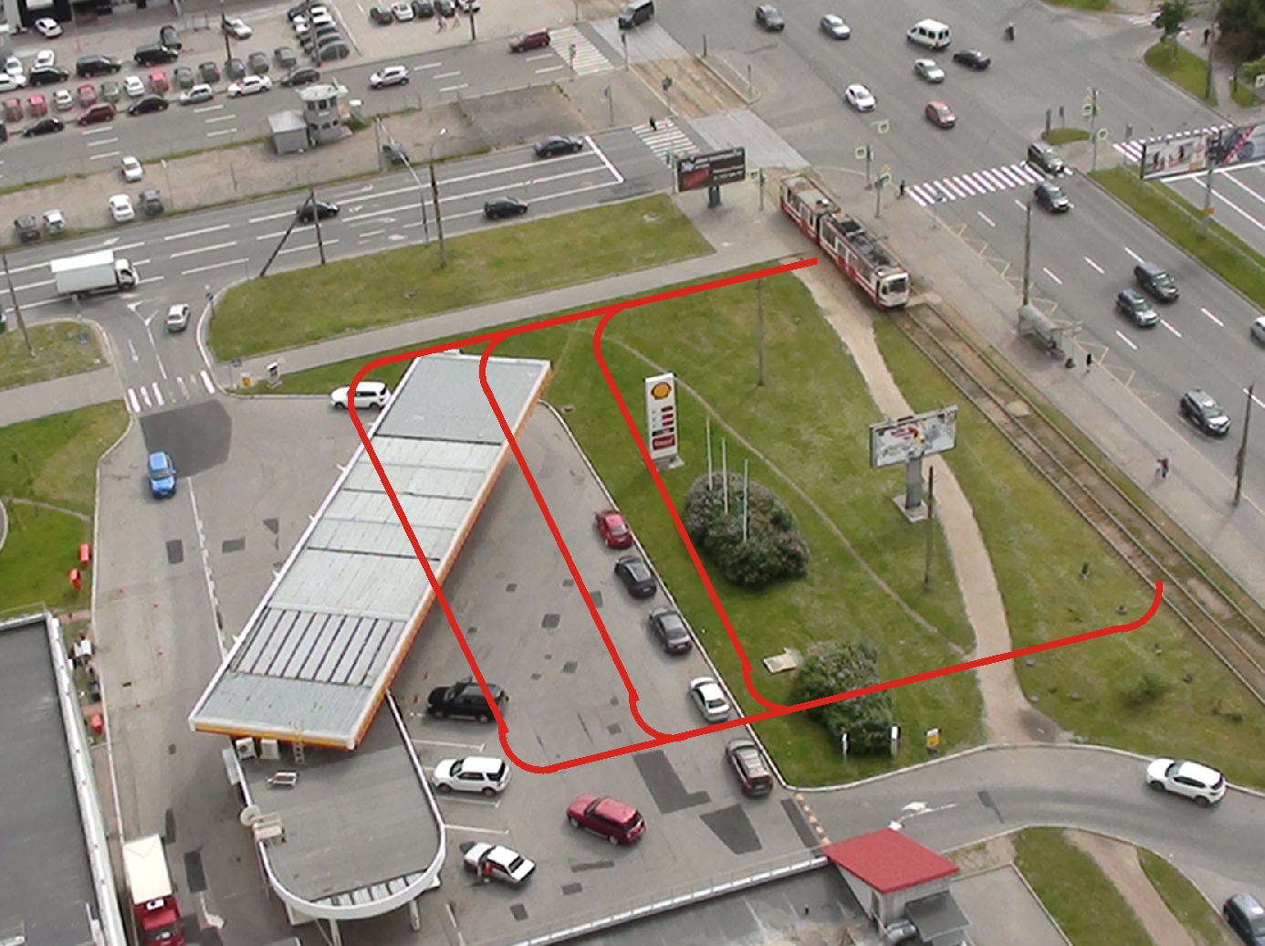 ИМХО, скорее всего, ныняшняя парковка (точнее место занятое ею) было предназначена для запуска туда трамваемв. Даже глядя на заправку становится ясно, что там могло бы быть кольцо. (очень часто на месте нынешних заправок ранее были трамвайные кольца, или проектировались, но так и не были построены).