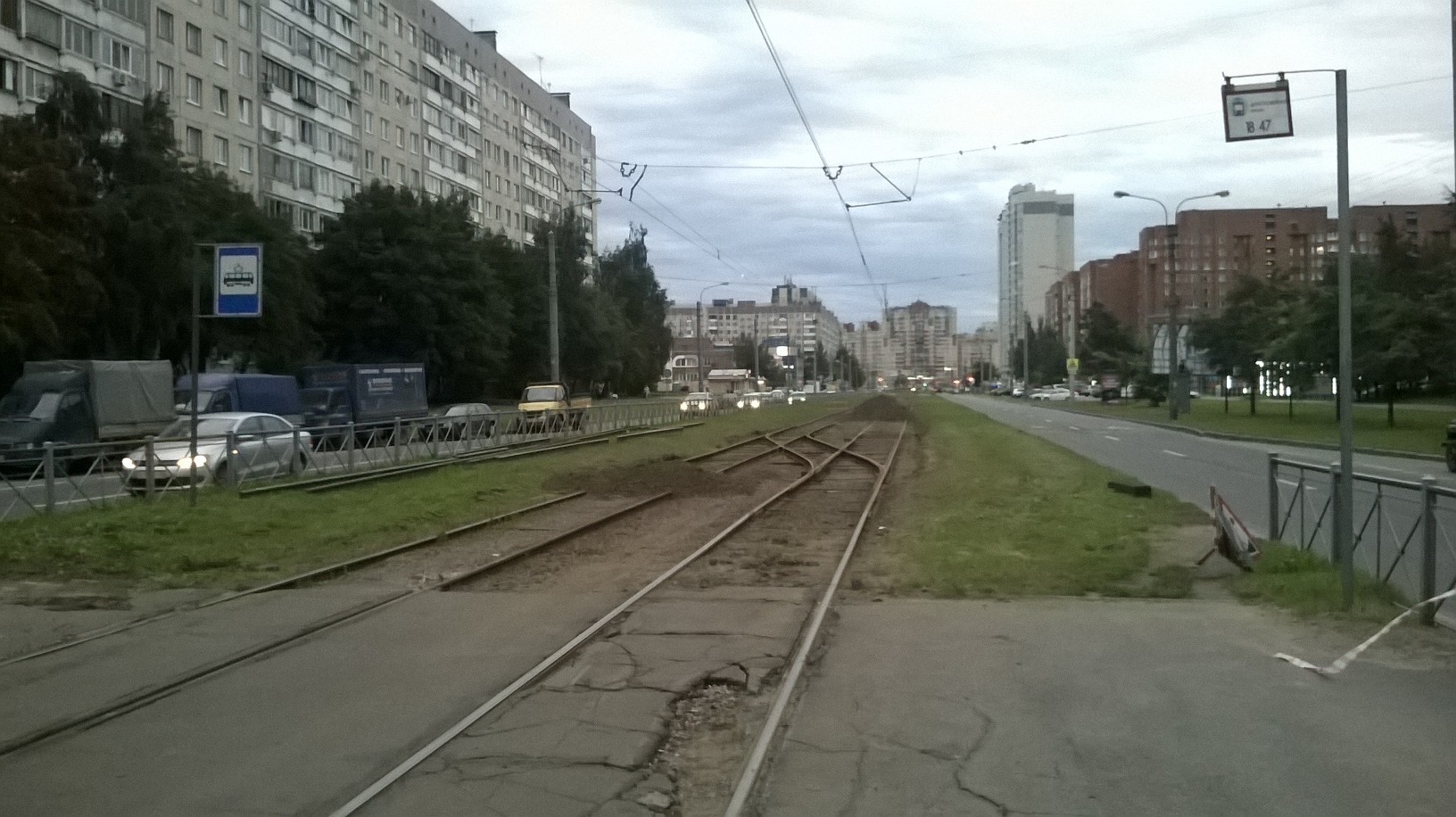 На пр. Авиаконструкторов делают съезд для временного оборота трамваев на остановке "Долгоозерная улица". За субботу уложили рельсы и стрелки. Вероятно, в воскресенье будут доделывать и заниматься контактной подвеской. На фото - вид со стороны остановки в сторону ул. Ильюшина/Стародеревенской ул. Кто знает, что за вагоны будут работать на 47 и 18 маршрутах с понедельника, 4 сентября?