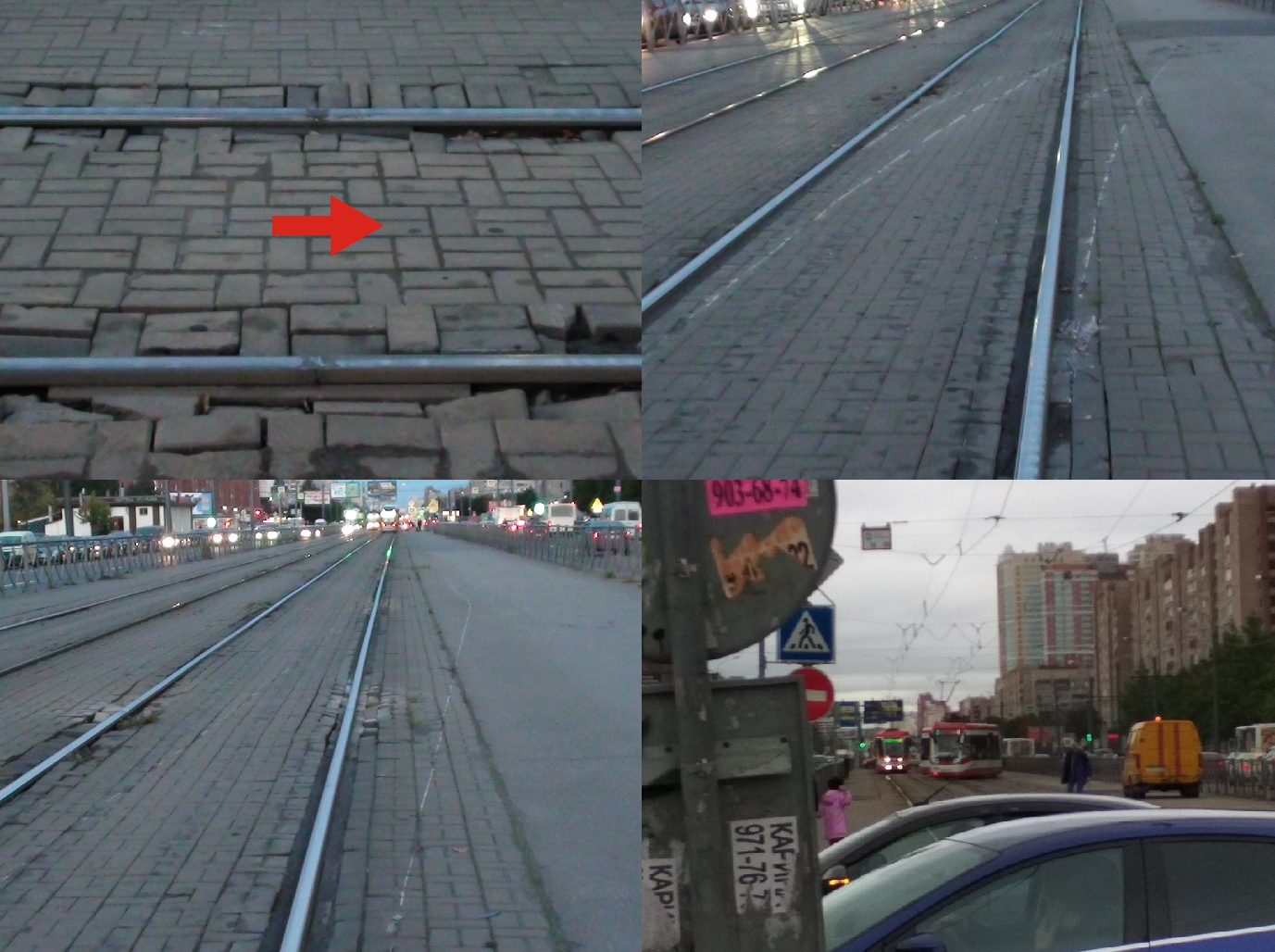 Сегодня побывал на том месте. Сход длительностью почти в весь перегон. Даже странно, как так долго он ехал не по рельсам. Сход начался сразу с первого стыка, как вагон пересёк Есенина (на фото есть стрелочка), и остановился только ближе к остановке на Фомина. Либо до перекрёстка успел мощно втопить, либо отказали тормоза. Ещё один момент - сход там как будто двойной. Сначала следы от одной телеги (верхнее правое фото), потом ещё следы от другой (нижнее левое). Первый след около 10 метров, затем второй след метров 60. Не представляю, как такое возможно. На фото сам трамвай стоит ближе к остановке, где следы и заказчниваются.
