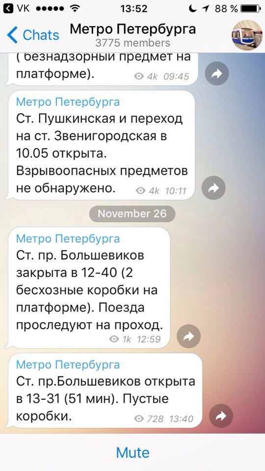 Сначала на вход и выход закрыли станцию «Улица Дыбенко», а тремя часами позднее «Проспект Большевиков». После проверок специалистами станции открыли, а ничего взрывоопасного не обнаружили.