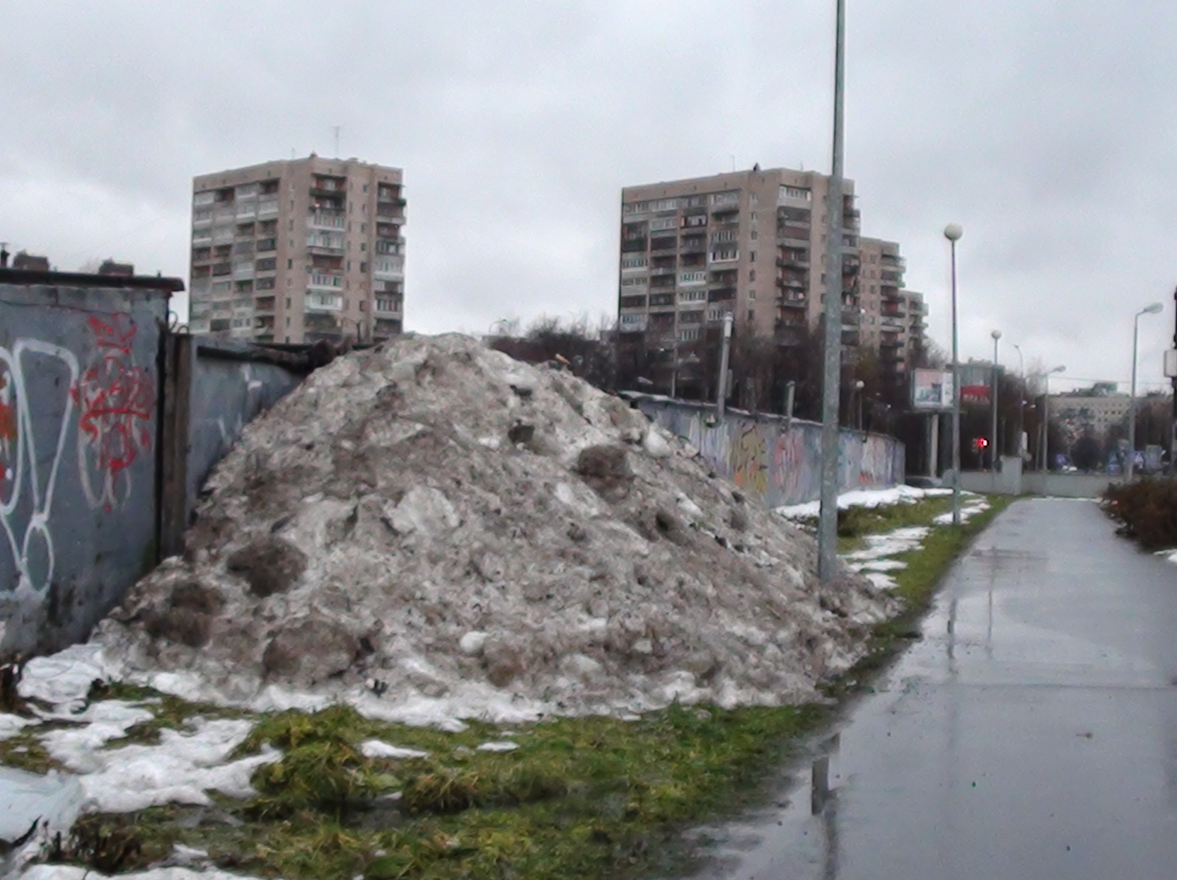 Талую воду никто не будет убирать, пока само не растает. Ещё хуже, когда мороз вдарит. Тогда тут можно неплохо навернуться, из-за образовавшегося катка. Зачем там забор, чтобы народ мучался?