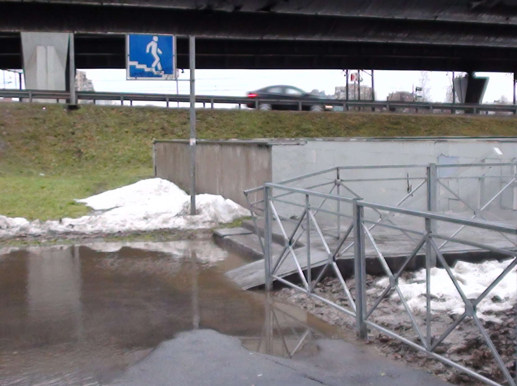 Из-за них, образовалась огромная лужа талой воды, которая течёт от них. Несколько дней назад установили забор перед входом в пешеходный тоннель. Зачем тут забор???