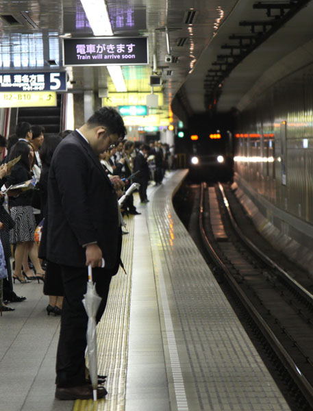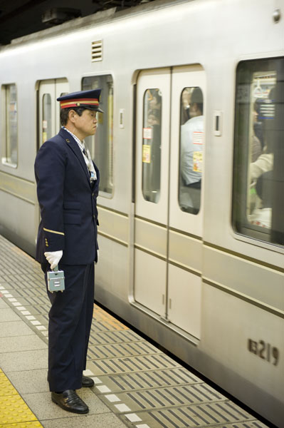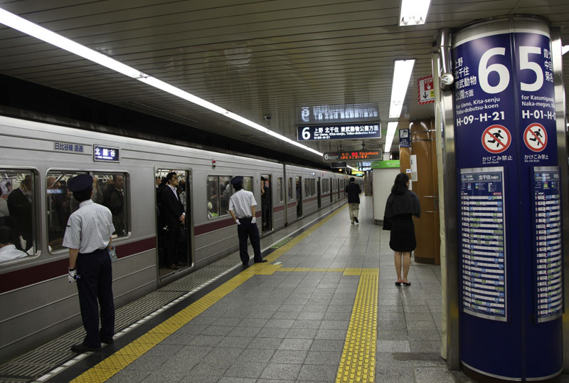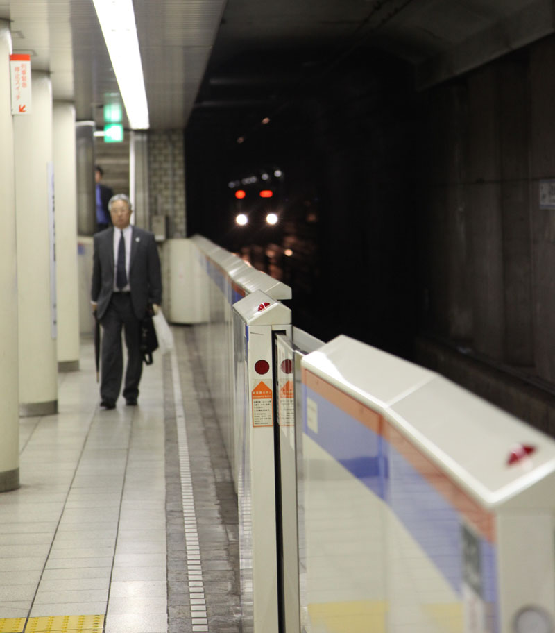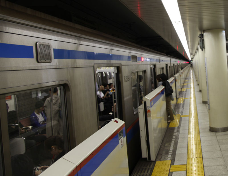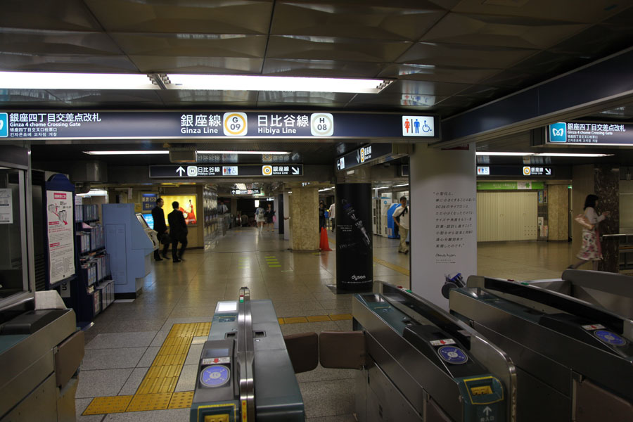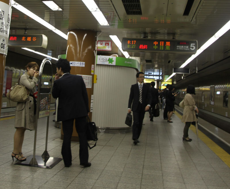 На дальнем плане в правой части фотографии терминалы для покупки проездных билетов. Кроме бумажных корешков, фото которого было раньше, японцы пользуются и бесконтактными картами, которые прикладывают к синему кругу, видному на переднем плане слева. Собственно в нашем метро в этом смысле все так же.