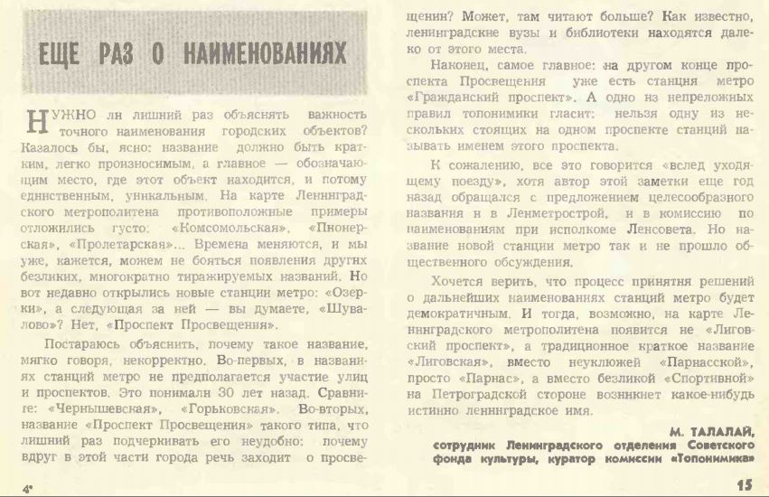 Заметка 1989 года, а такое ощущение, что автор - чиновник из нашего времени. Поразительная некомпетентность куратора топонимической комиссии, особенно про район проспекта Просвещения, где типа "читают больше".
