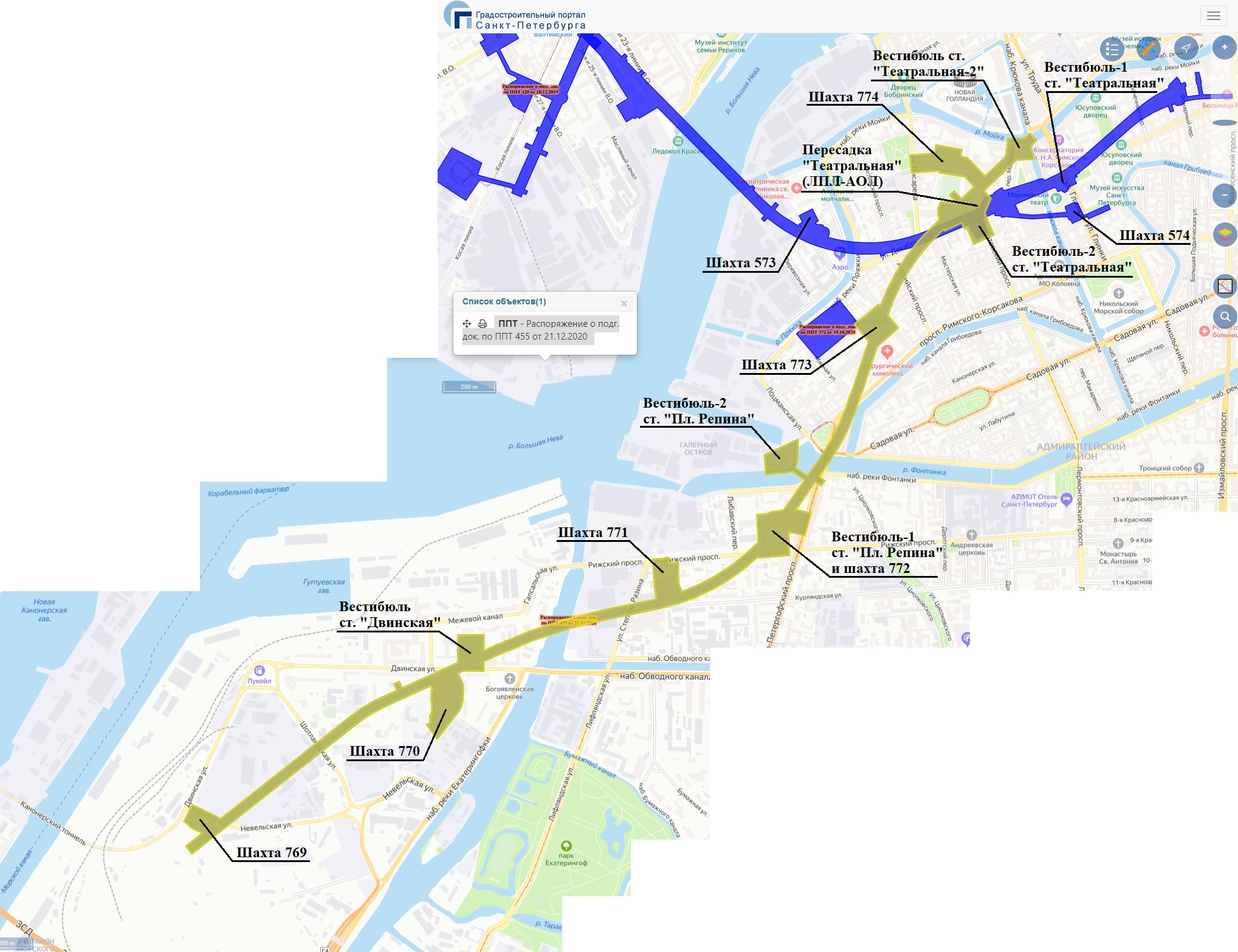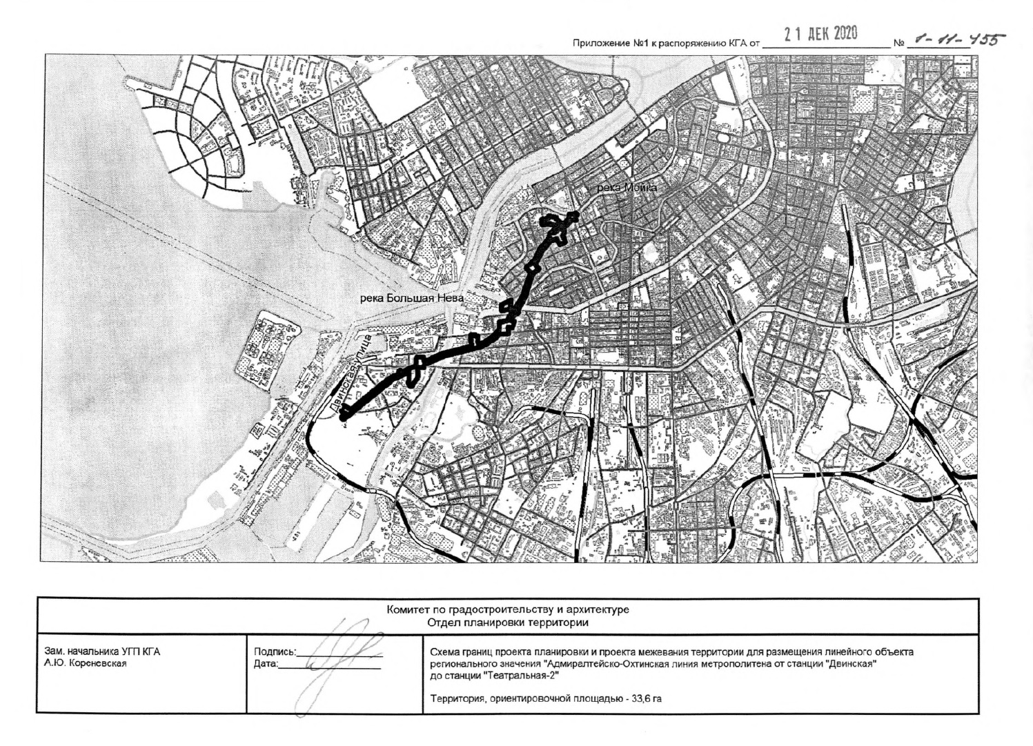 21 декабря 2020 г. подписано Распоряжение КГА № 1-11-455 "О подготовке документации по планировке территории для размещения линейного объекта регионального значения "Адмиралтейско-Охтинская линия метрополитена от станции "Двинская" до станции "Театральная-2".
