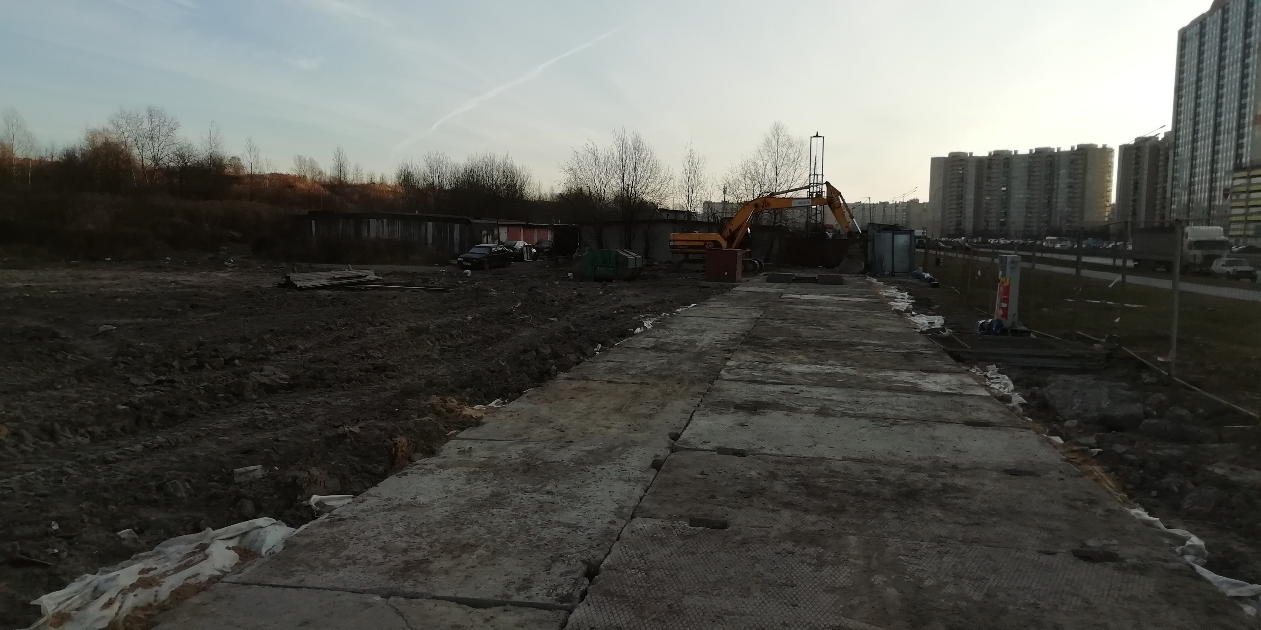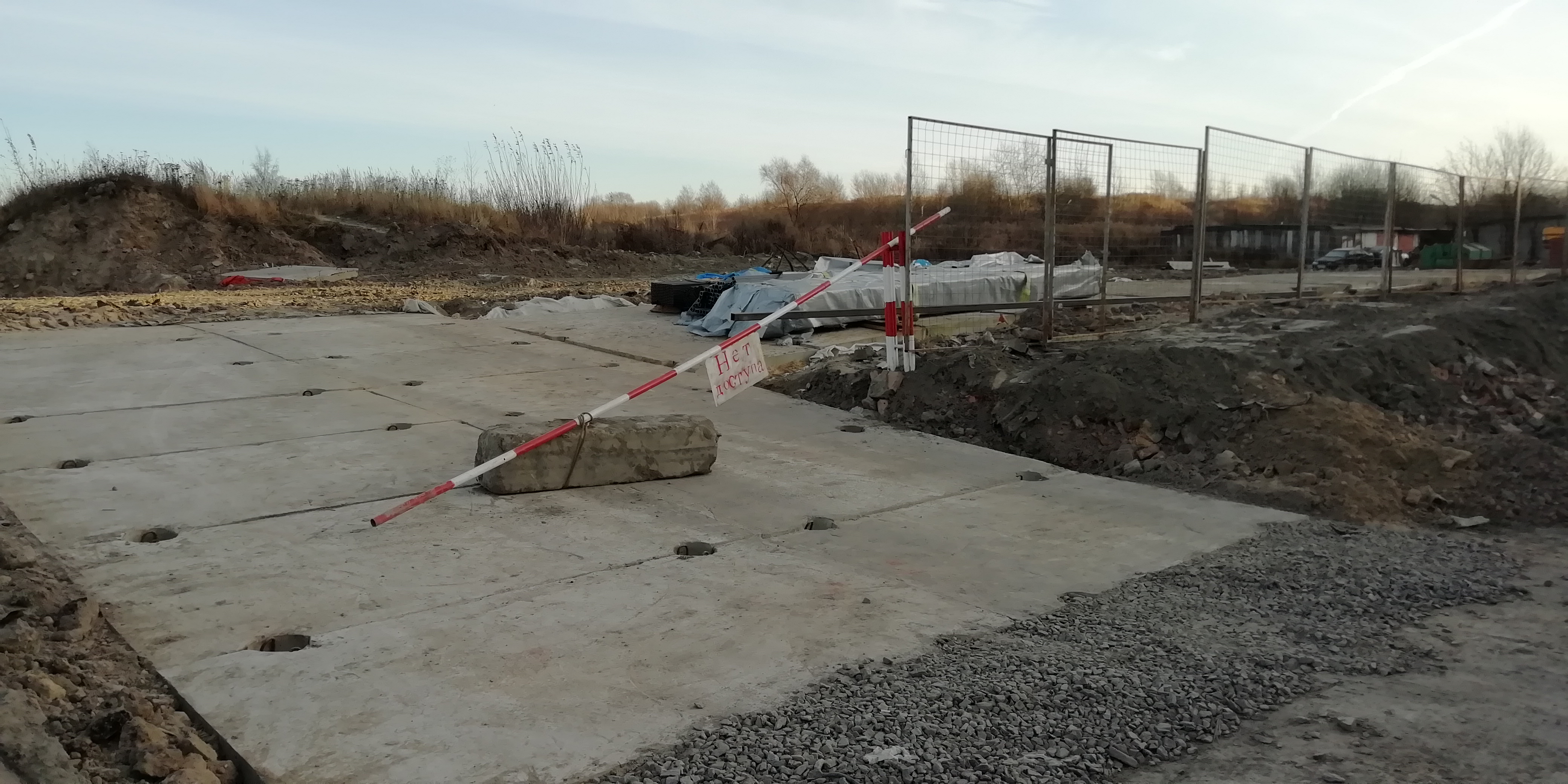 Въезд на территорию строительной площадки и уложенные бетонные плиты. Видна одна бытовка и экскаватор: