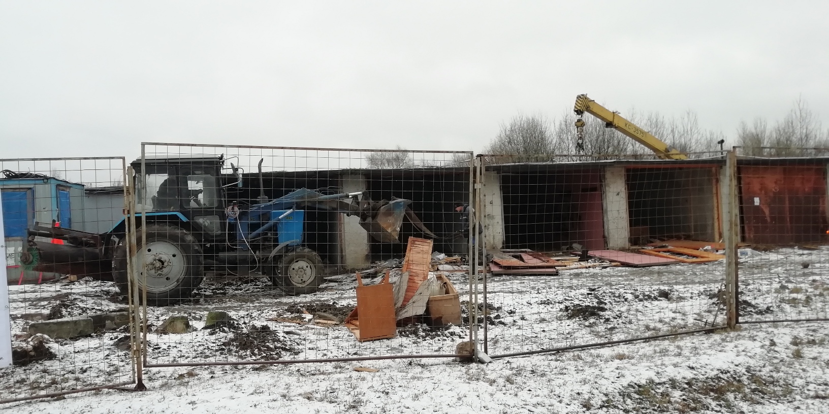 Разбирают гаражи, делают ограждение, кладут плиты для временной дороги.