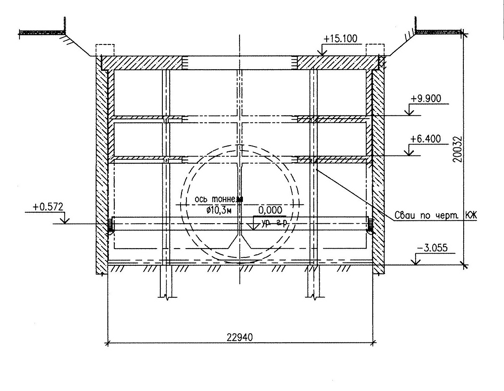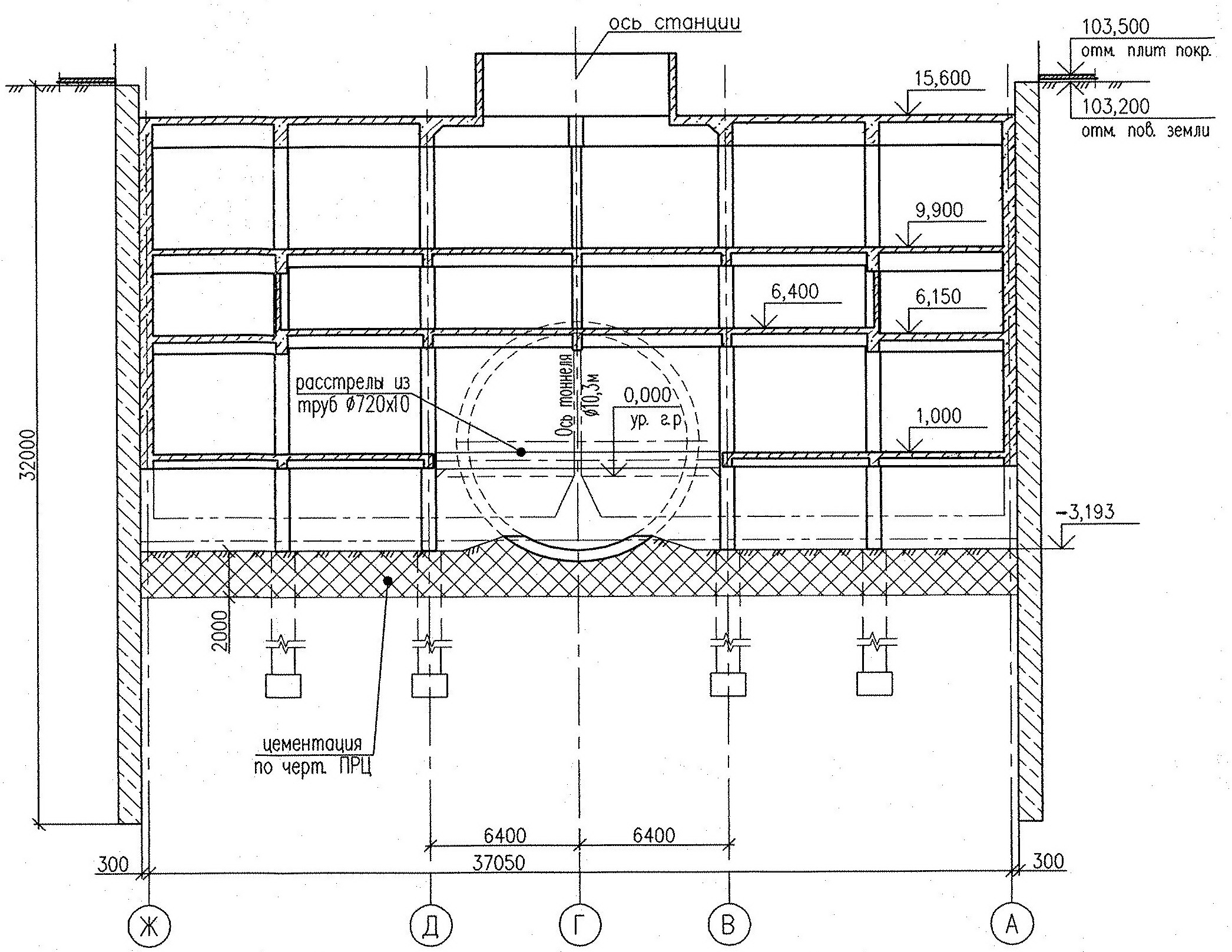 Выше на схеме Новокрестовской свод двухпутного тоннеля таки пересекает перекрытие +6,400 в осях Д-В, на месте которого сейчас смонтированы расстрелы между колоннами.
